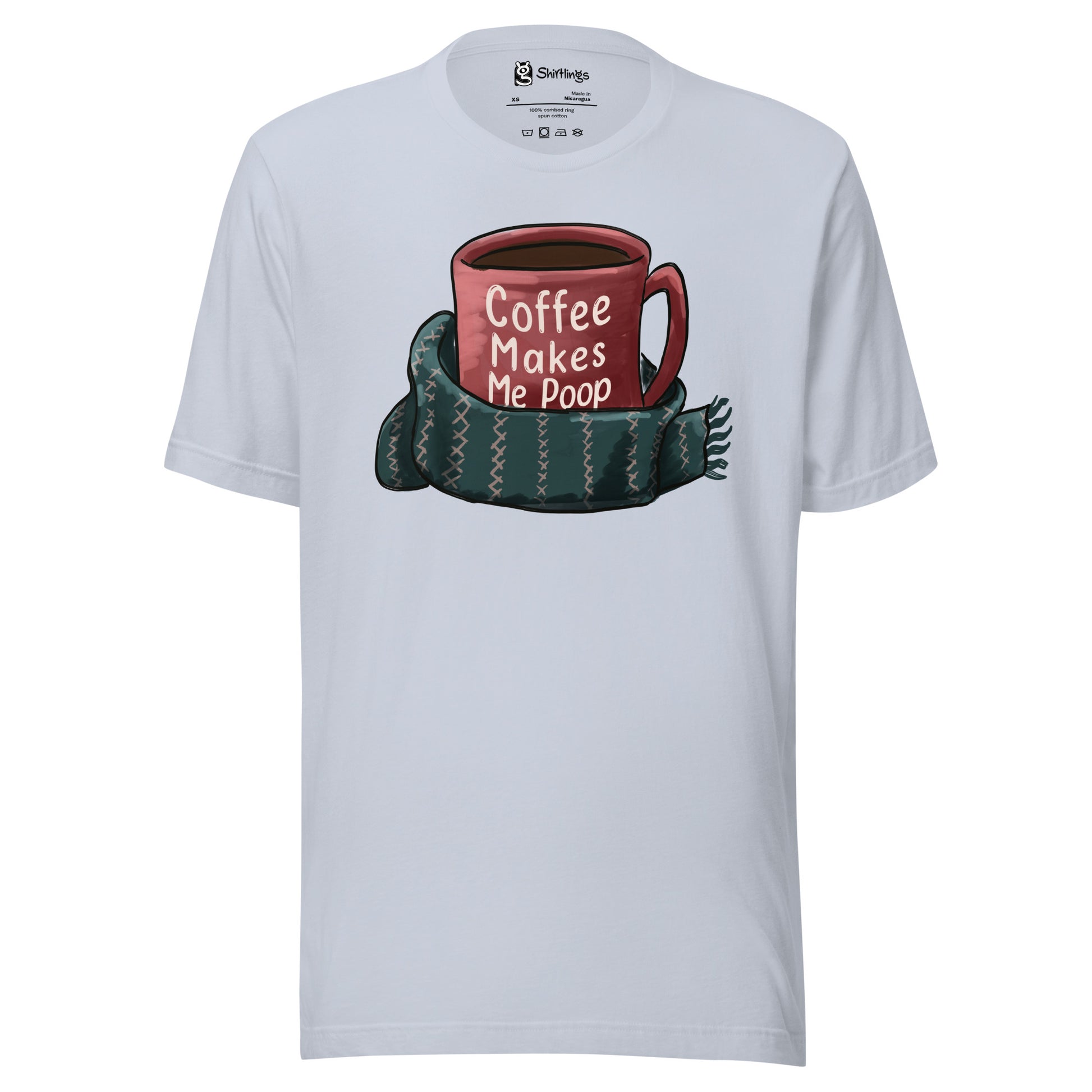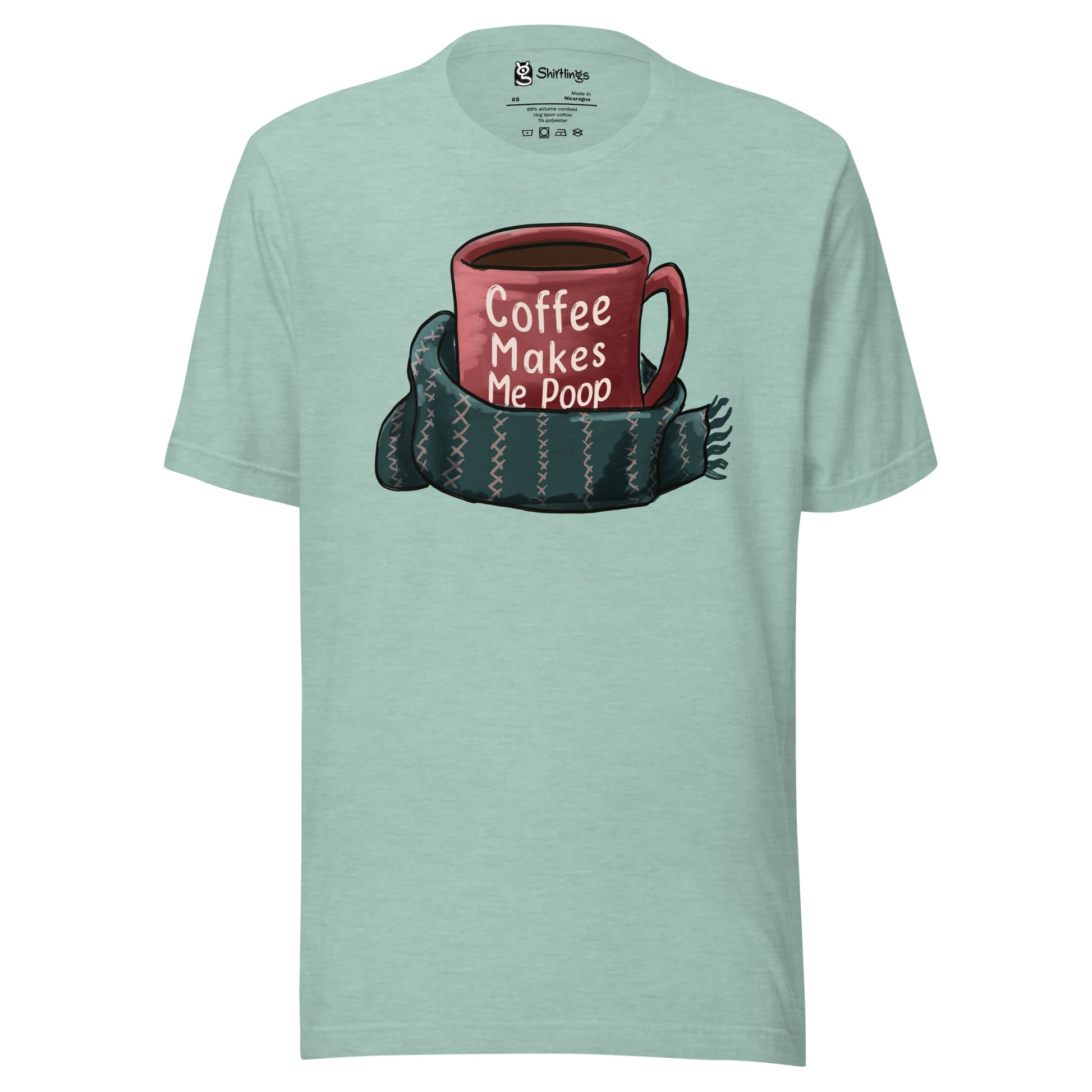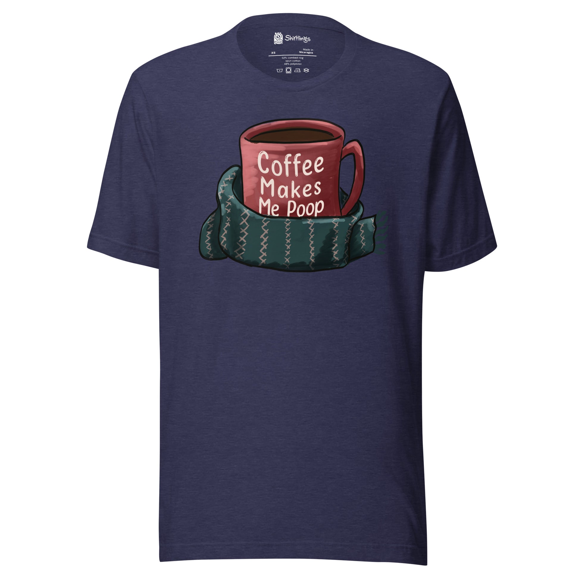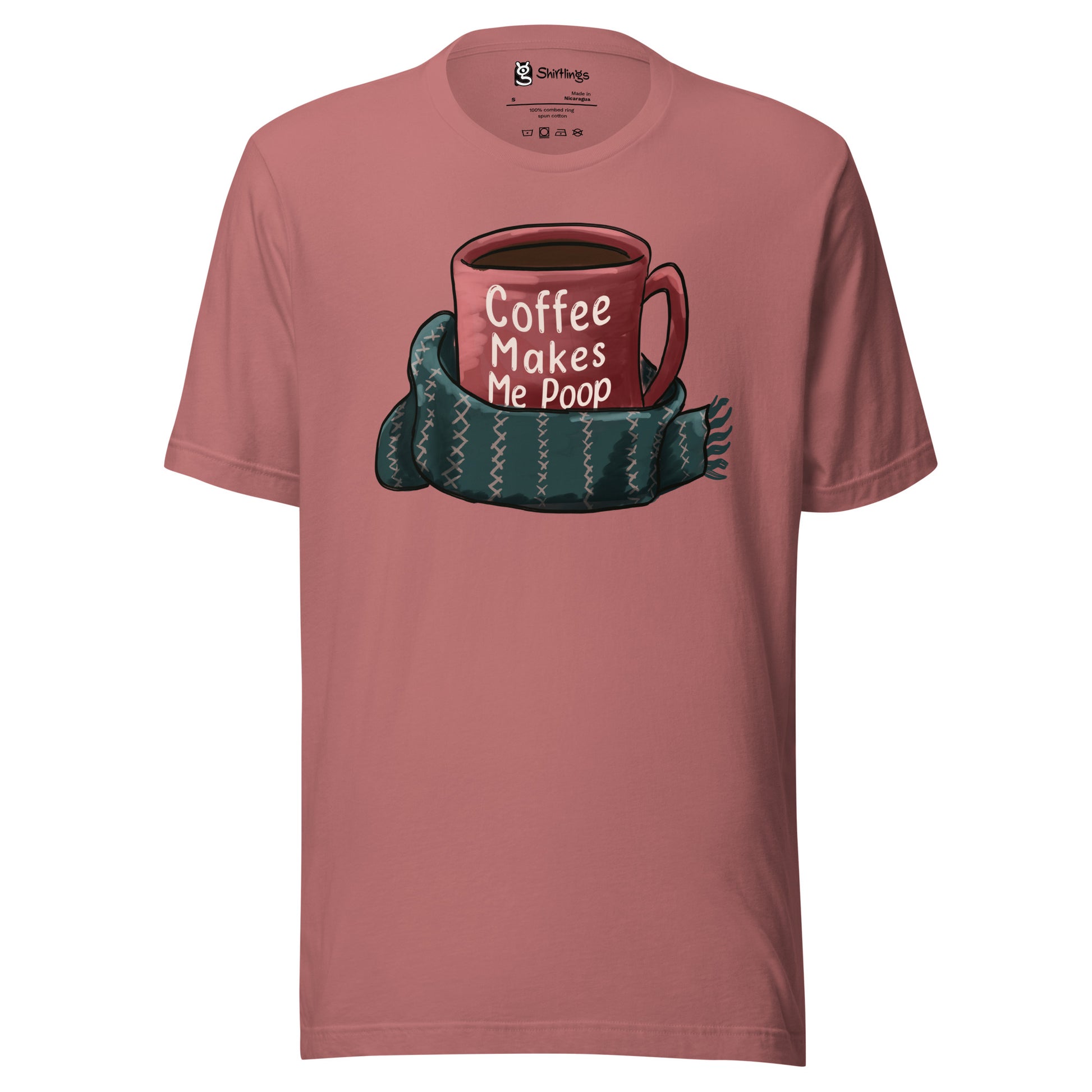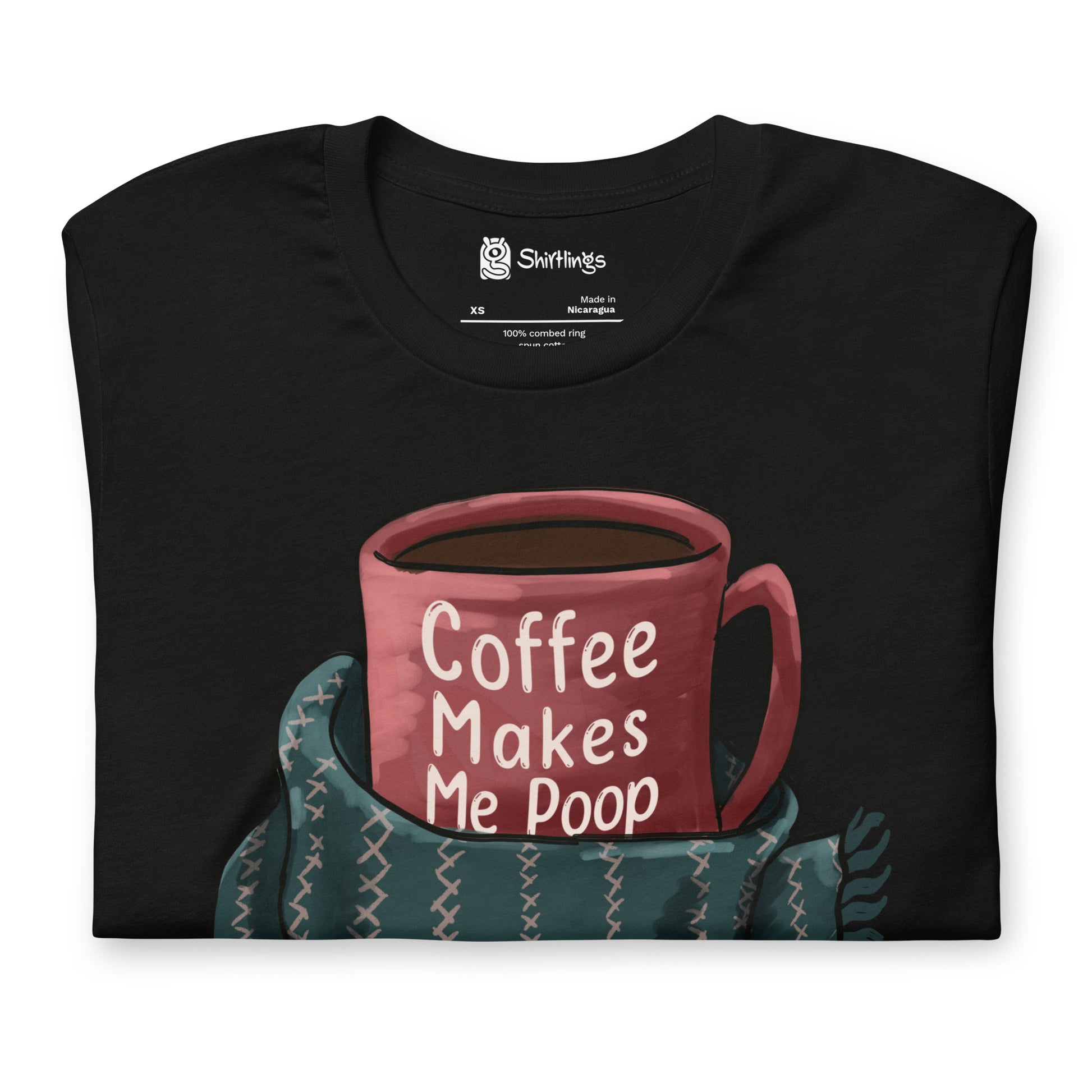 Embrace your coffee addiction with our 'Coffee Makes Me Poop' adult tee. This delightful shirt, featuring a coffee mug wrapped in a scarf, is the perfect brew of humor and style for your daily grind.