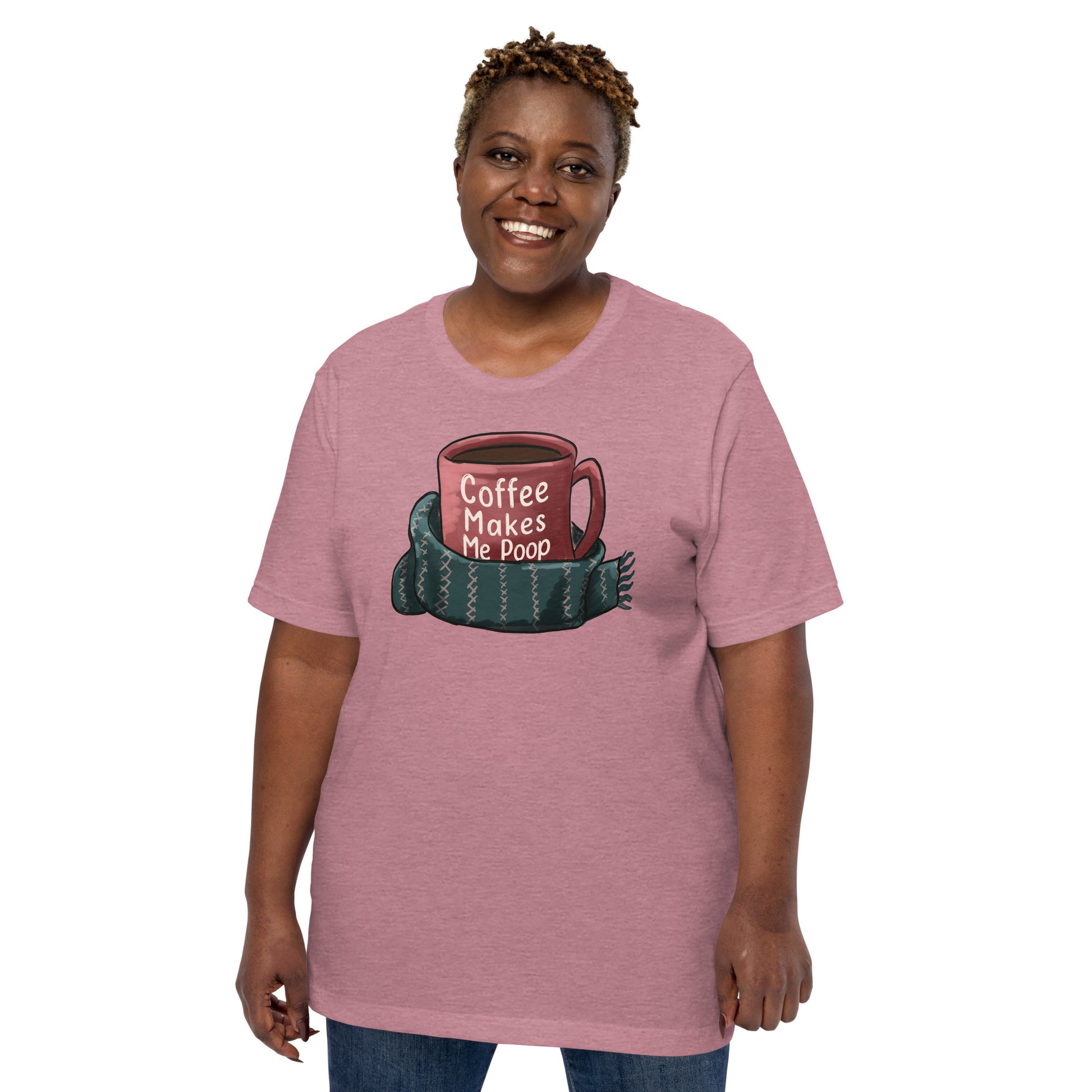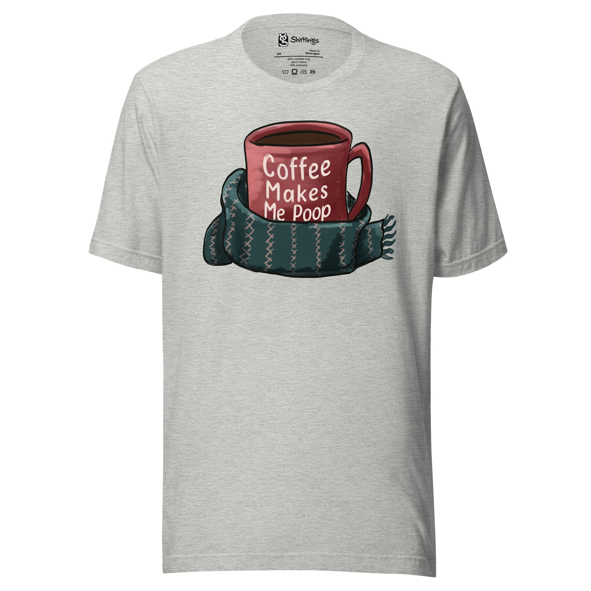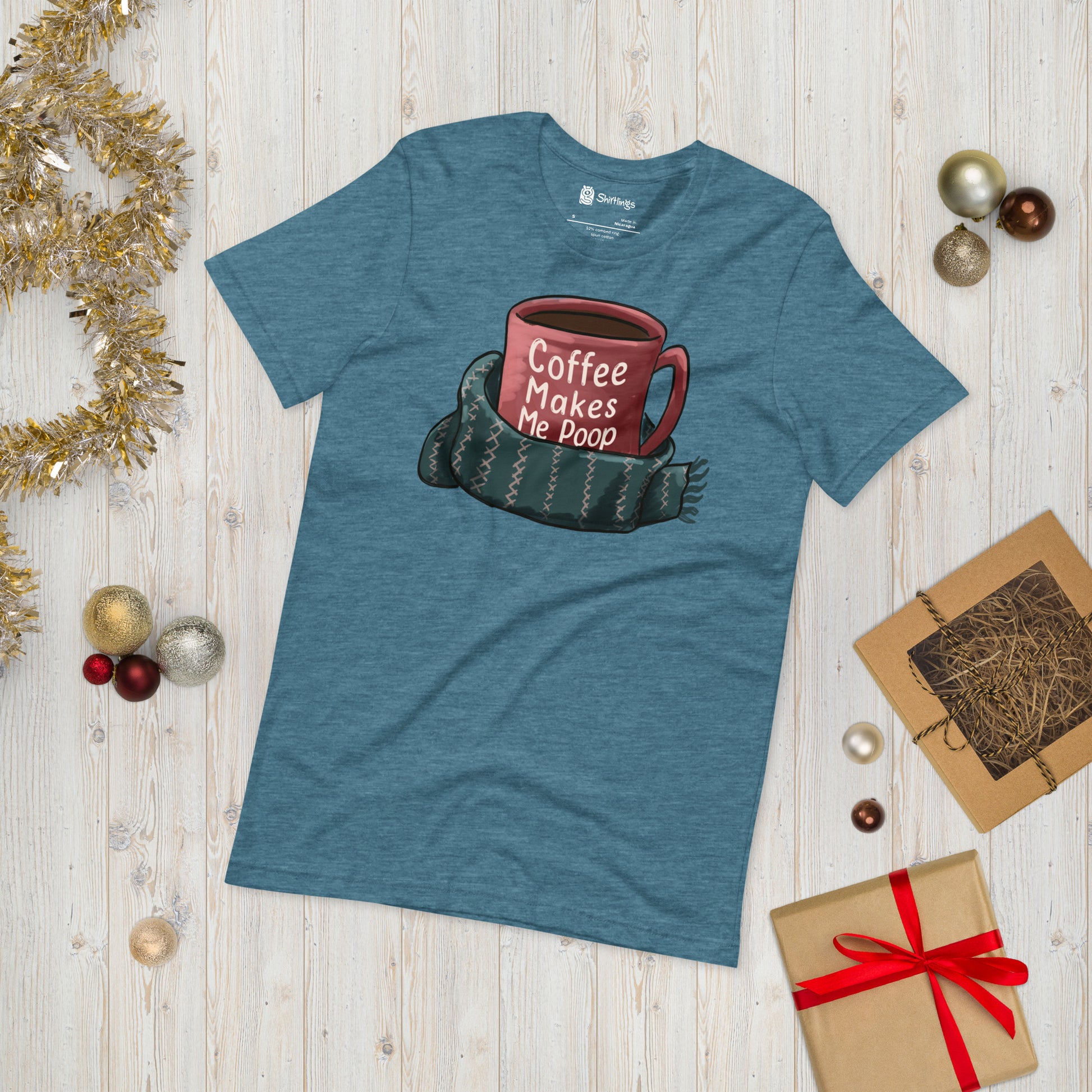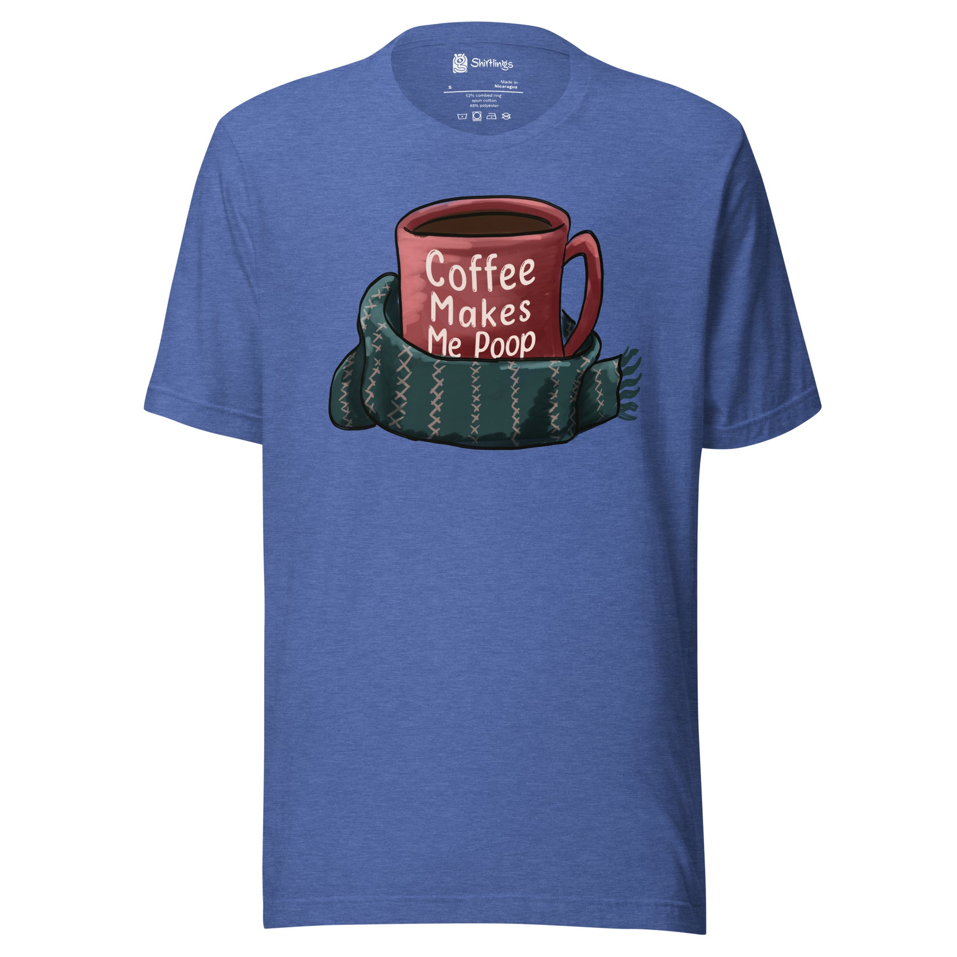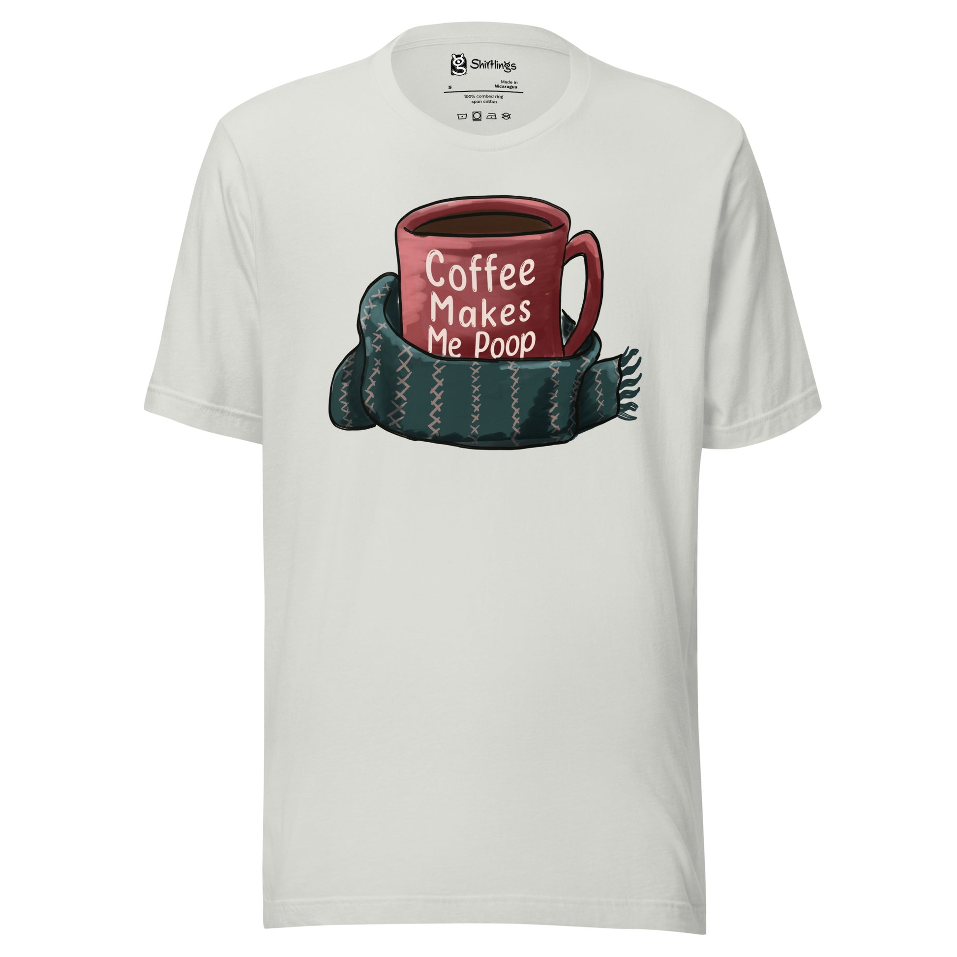 Embrace your coffee addiction with our 'Coffee Makes Me Poop' adult tee. This delightful shirt, featuring a coffee mug wrapped in a scarf, is the perfect brew of humor and style for your daily grind.