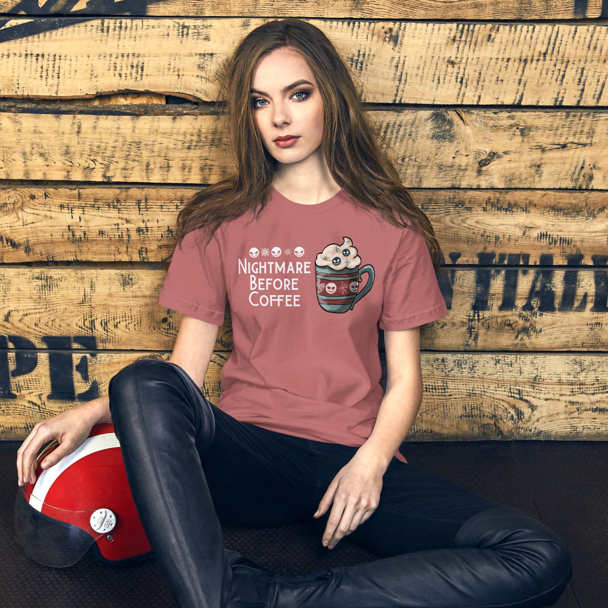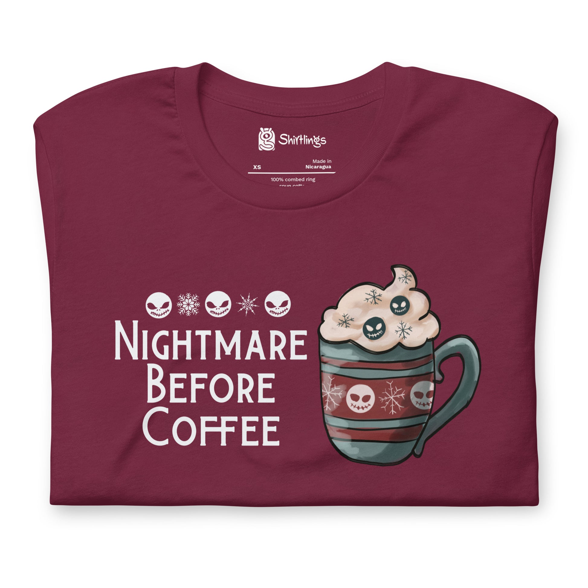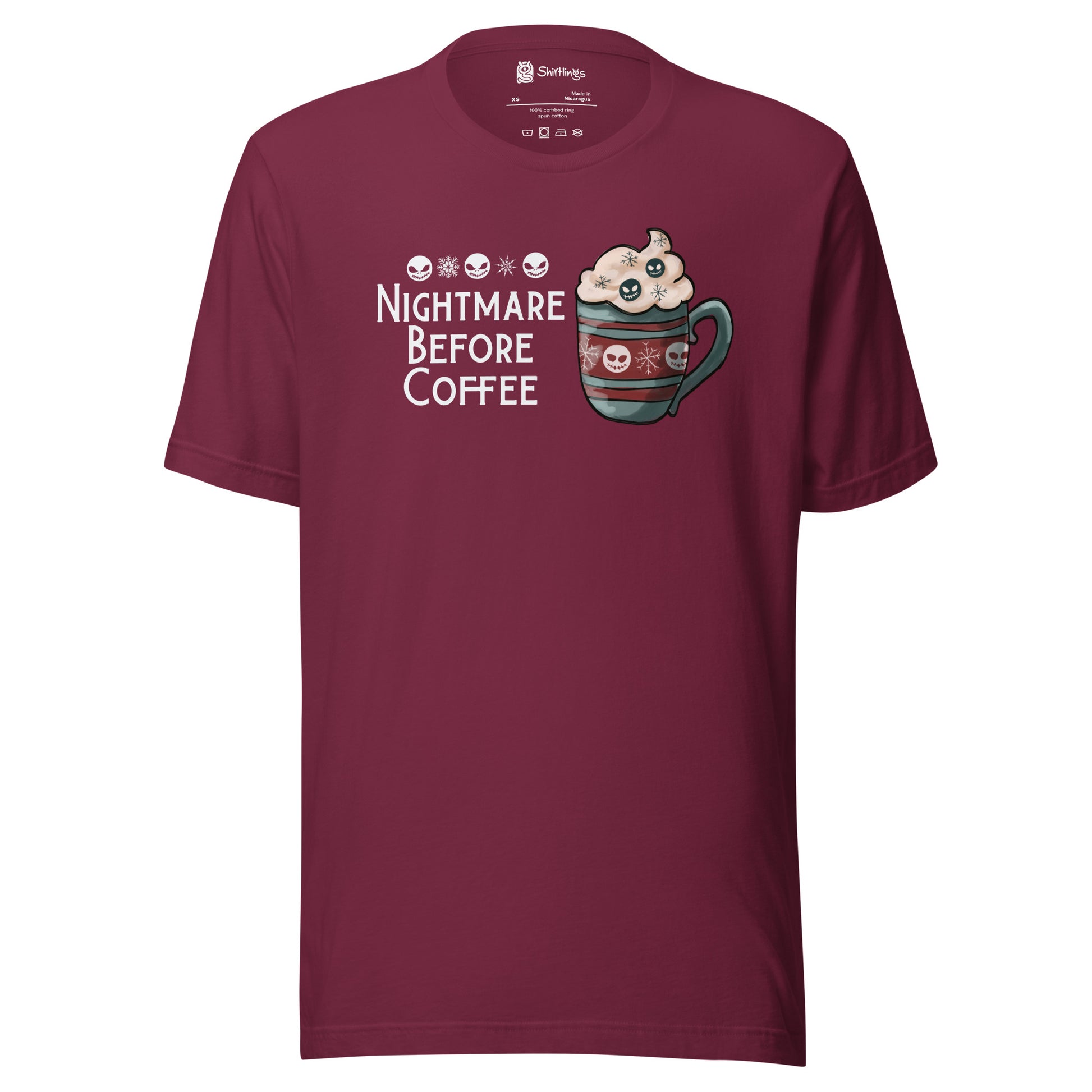Add a touch of spooky to your morning brew with our 'Nightmare Before Coffee' adult tee, featuring a striped coffee mug adorned with snowflakes and skulls. It's the perfect way to start your day with a dash of Halloween & Christmas spirit and caffeine-induced fun.