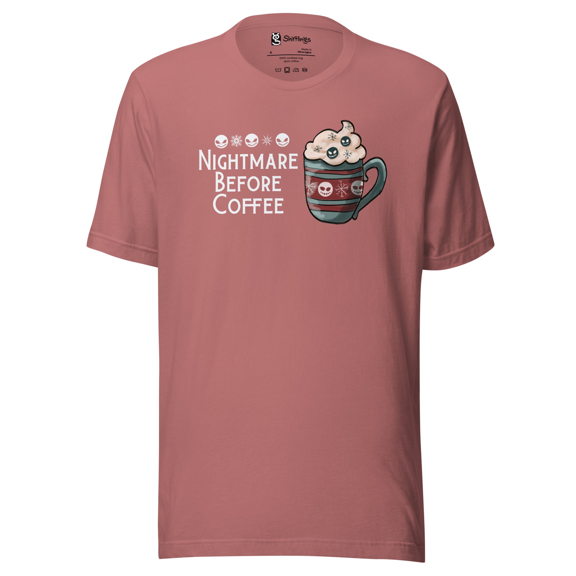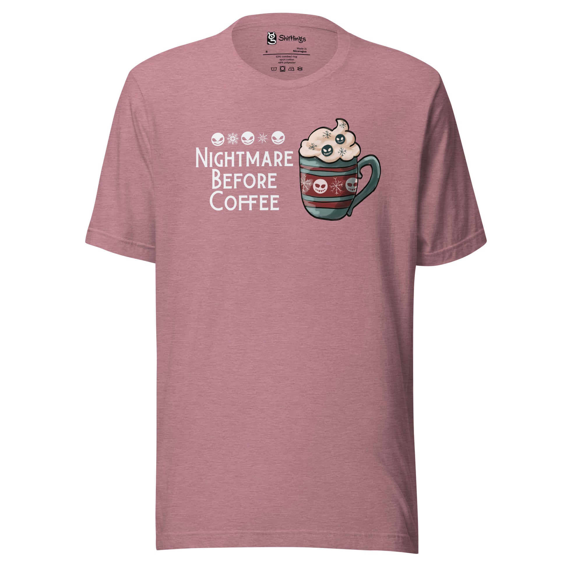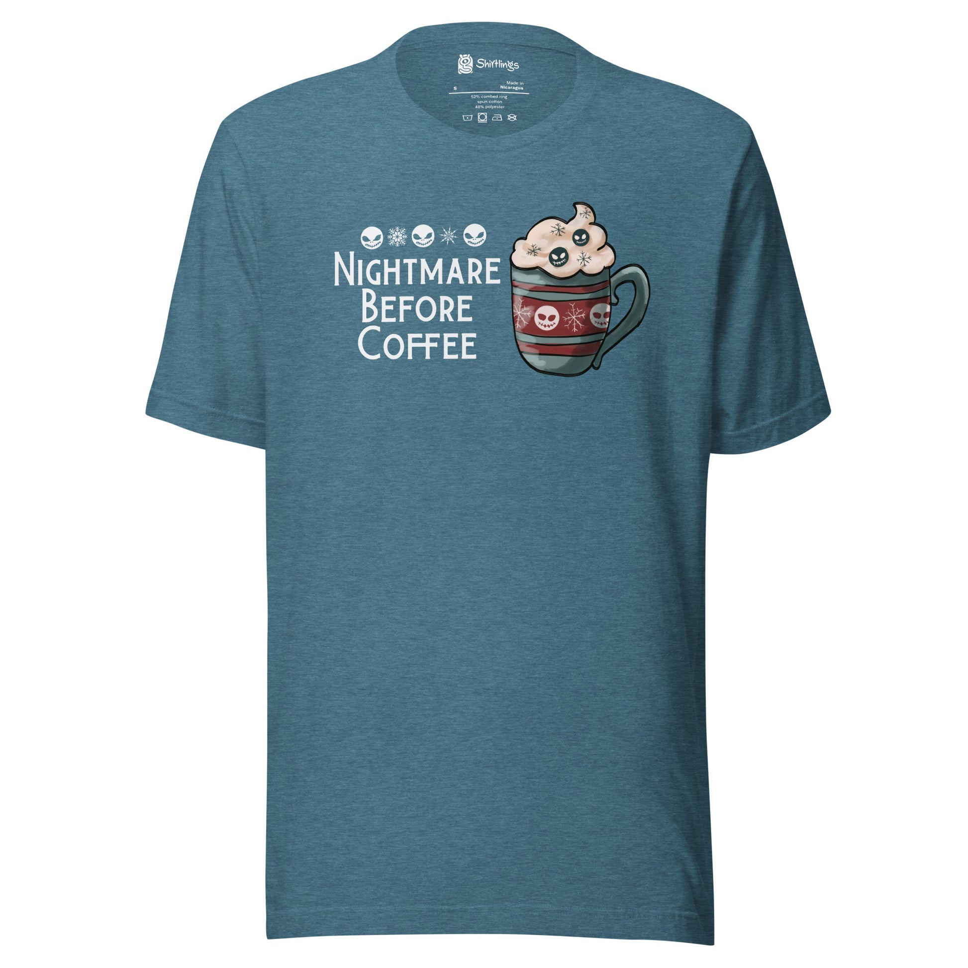 Add a touch of spooky to your morning brew with our 'Nightmare Before Coffee' adult tee, featuring a striped coffee mug adorned with snowflakes and skulls. It's the perfect way to start your day with a dash of Halloween & Christmas spirit and caffeine-induced fun.
