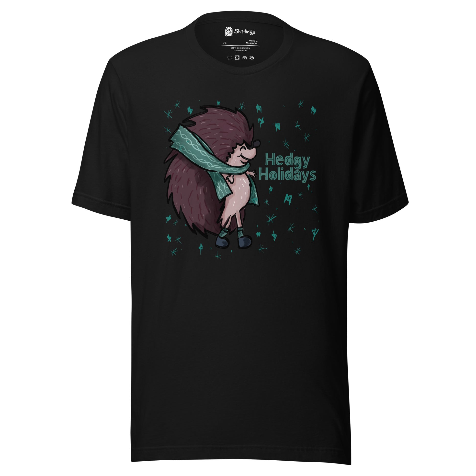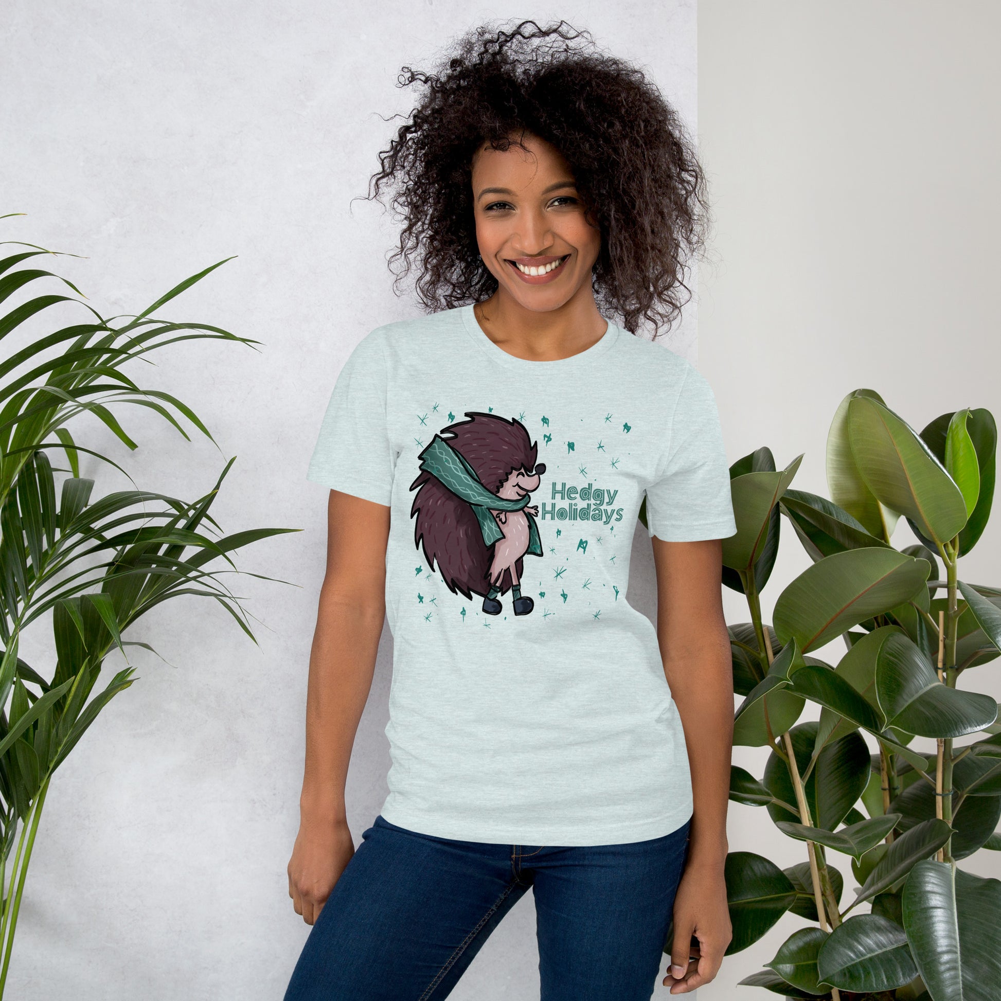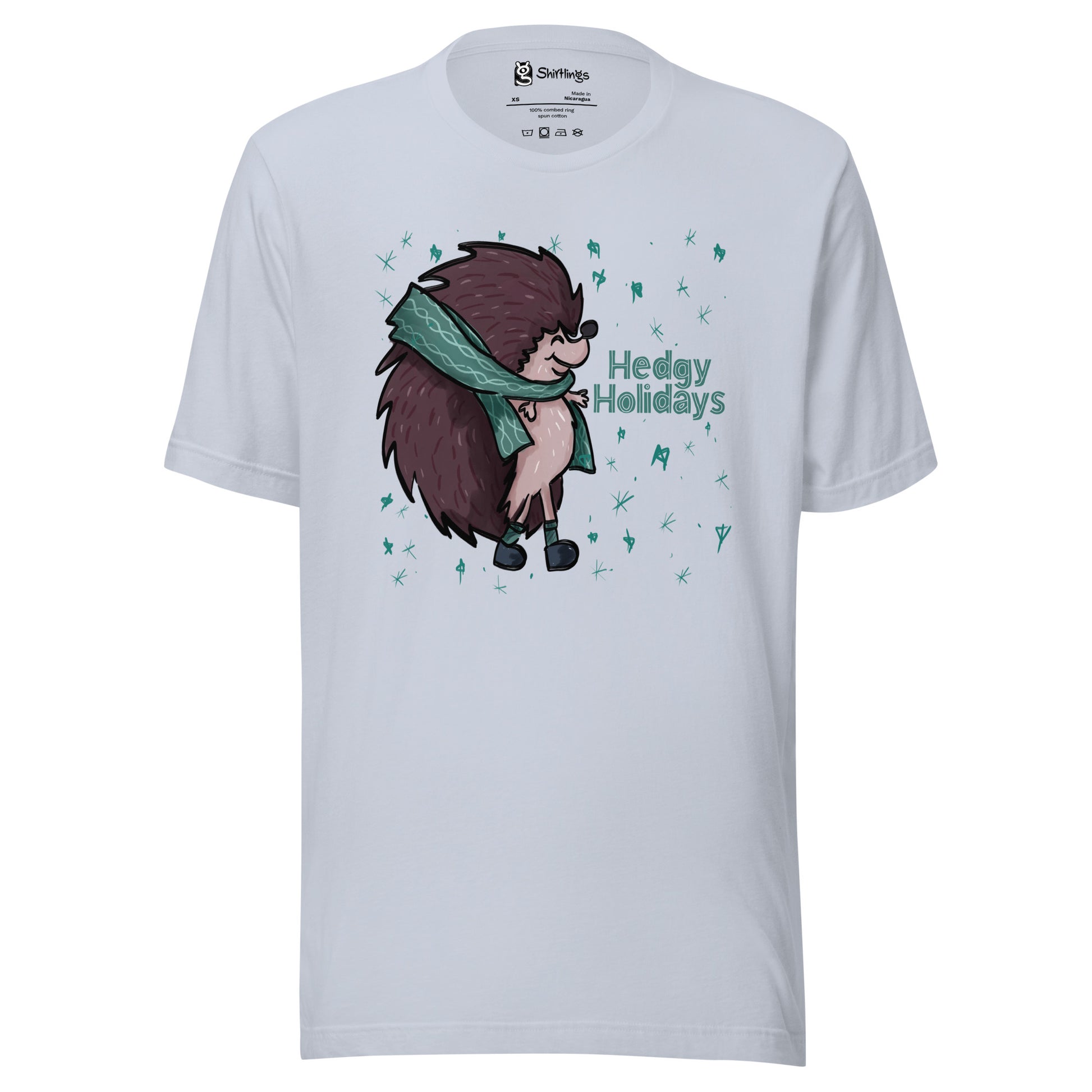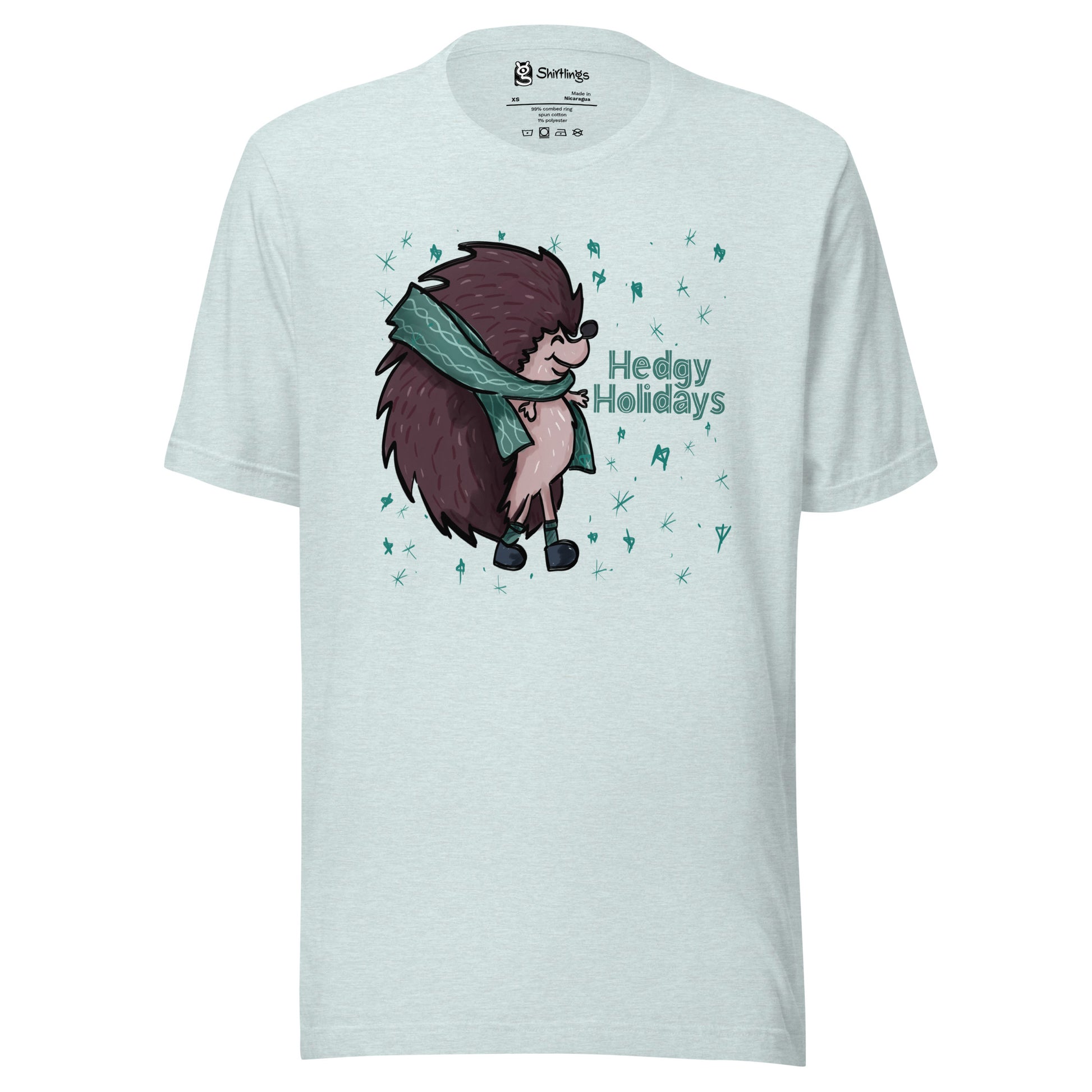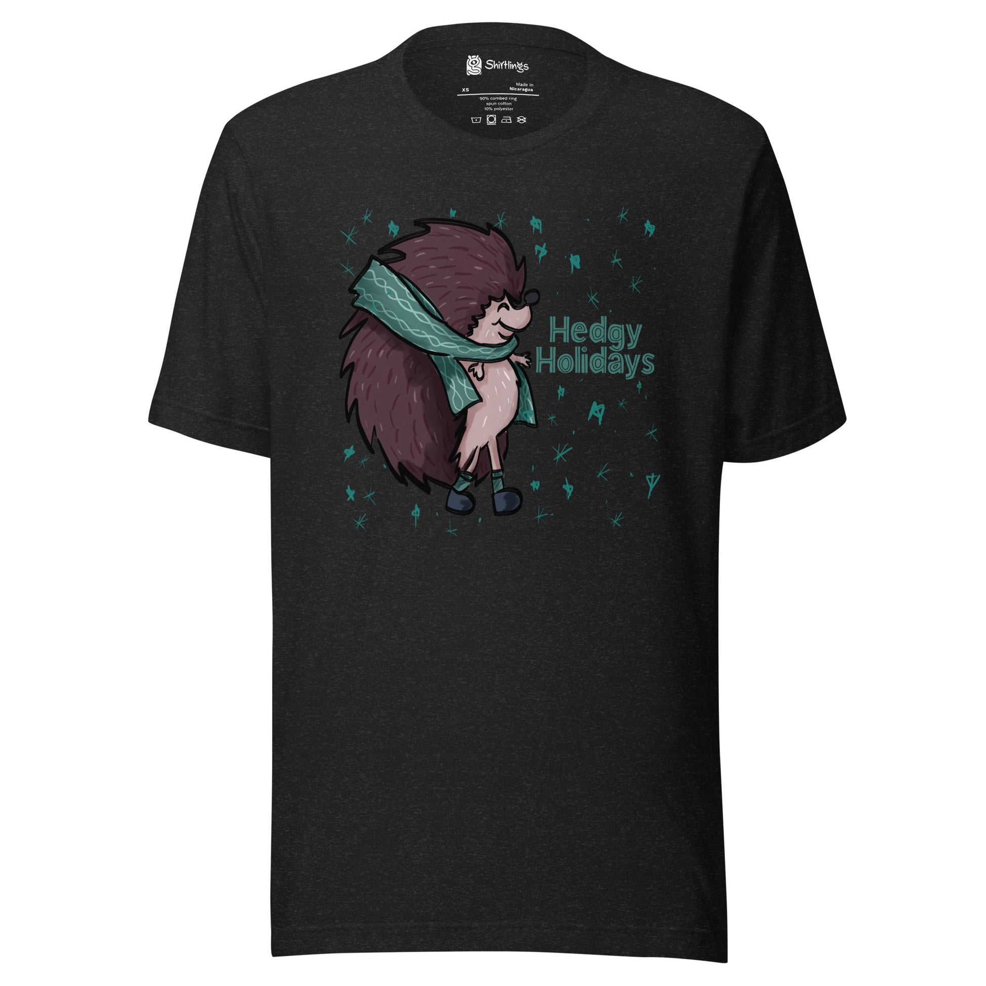 Embrace the hedgehog charm this holiday season with our 'Hedgy Holidays' adult tee. Featuring a cute hedgehog donning a scarf and surrounded by snowflakes, it's your go-to shirt for festive fun.