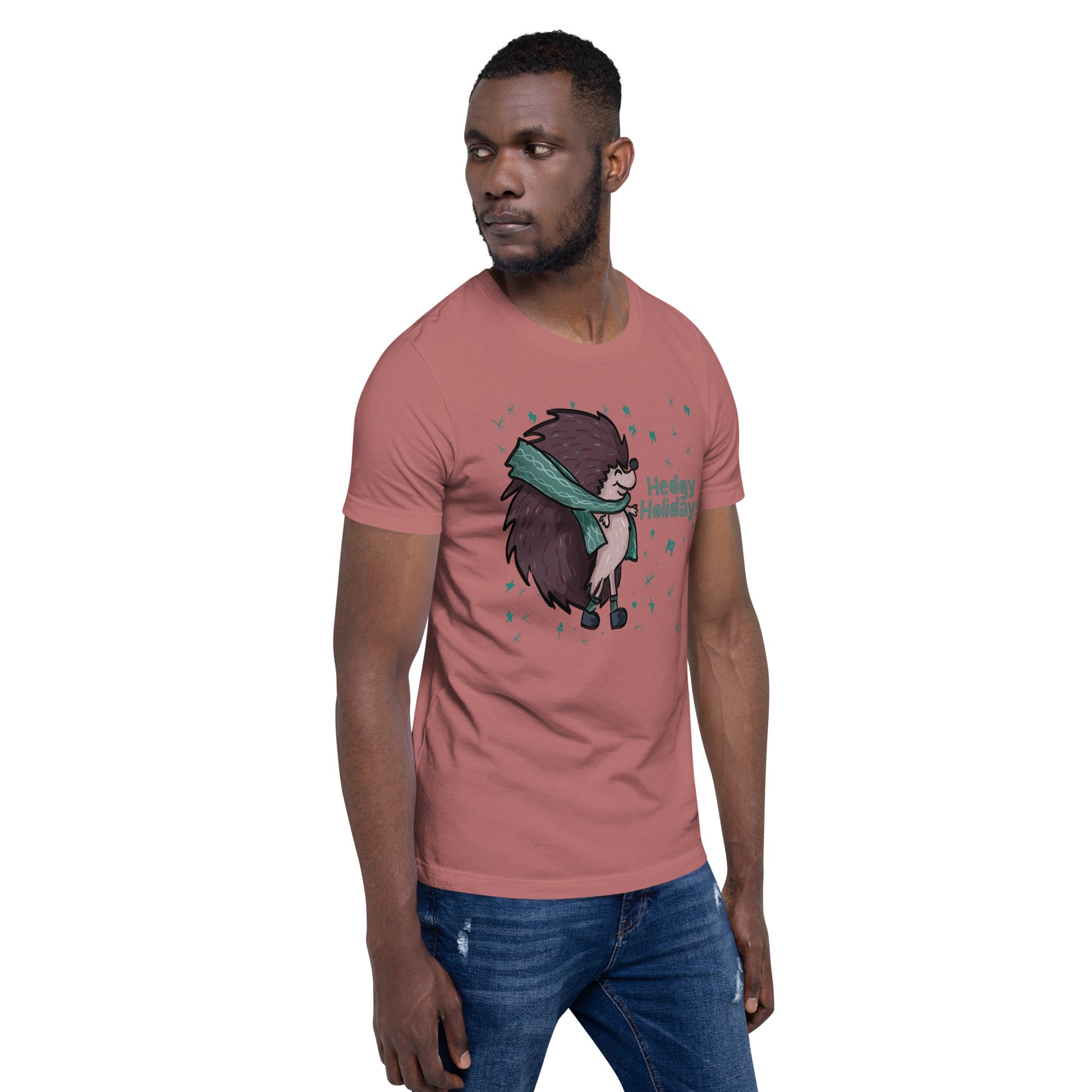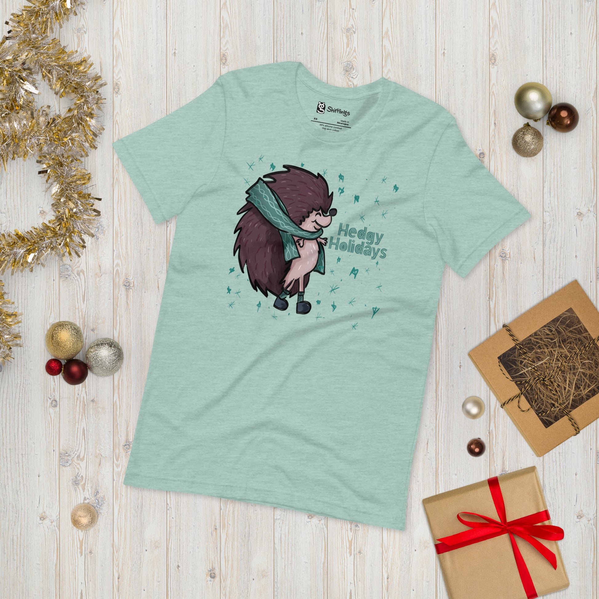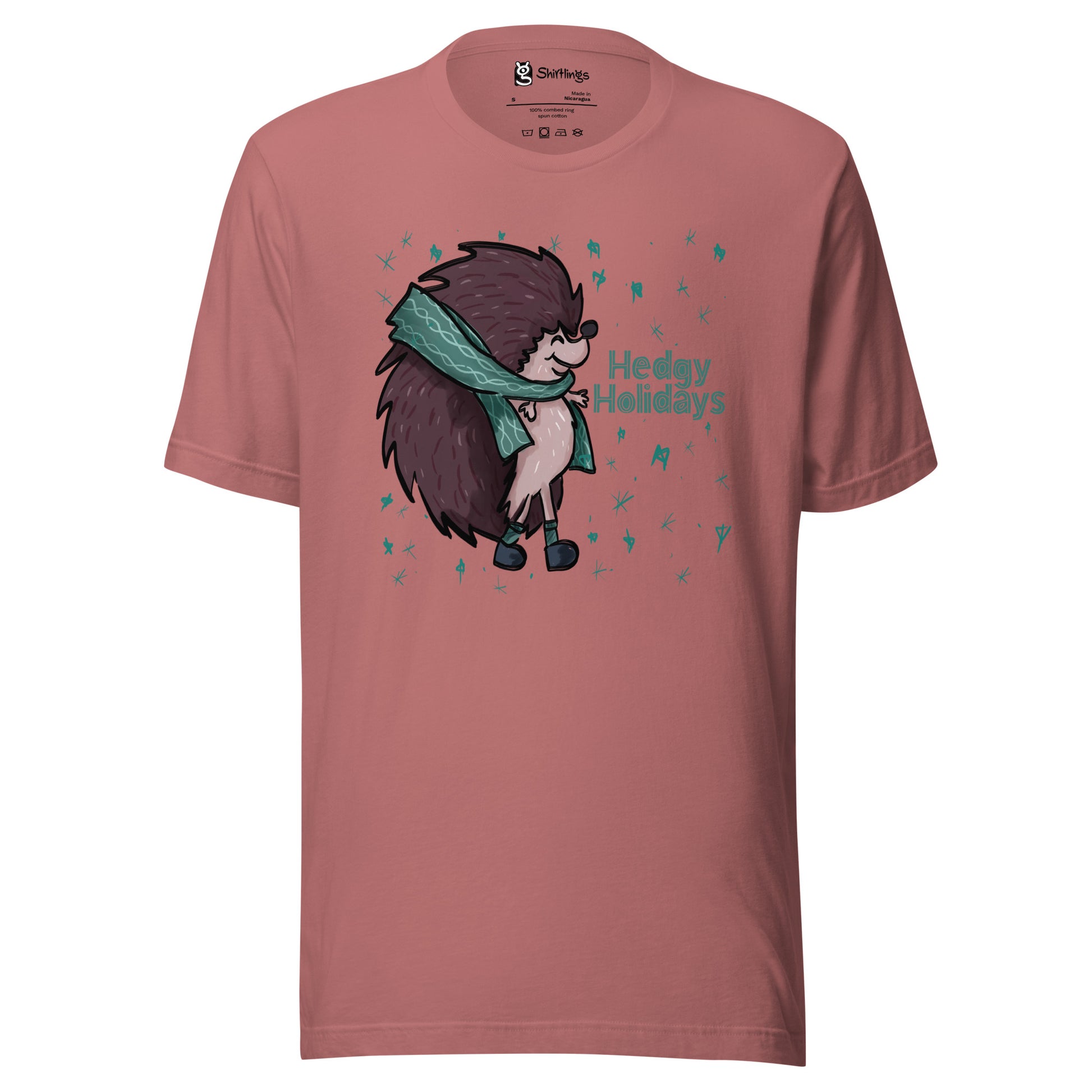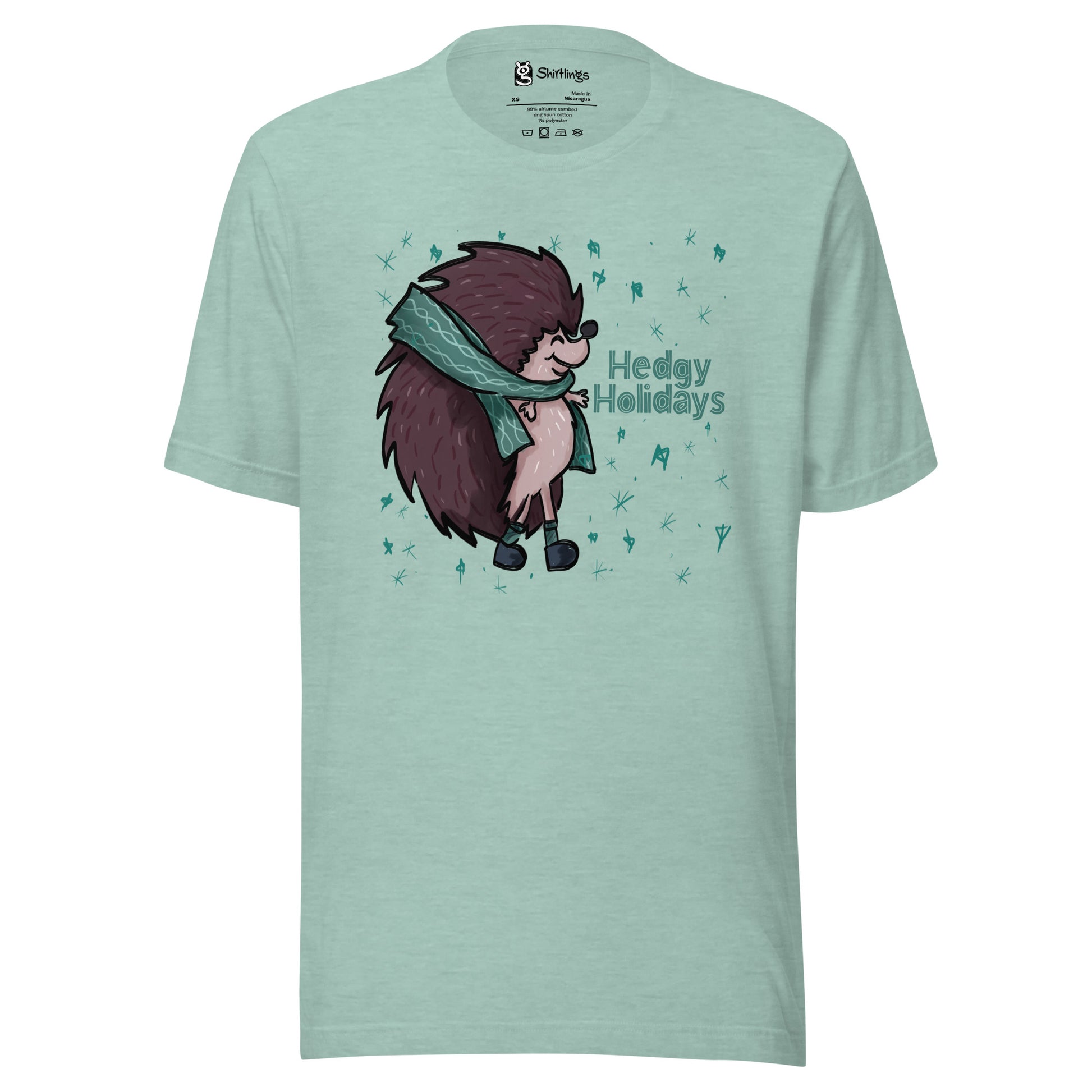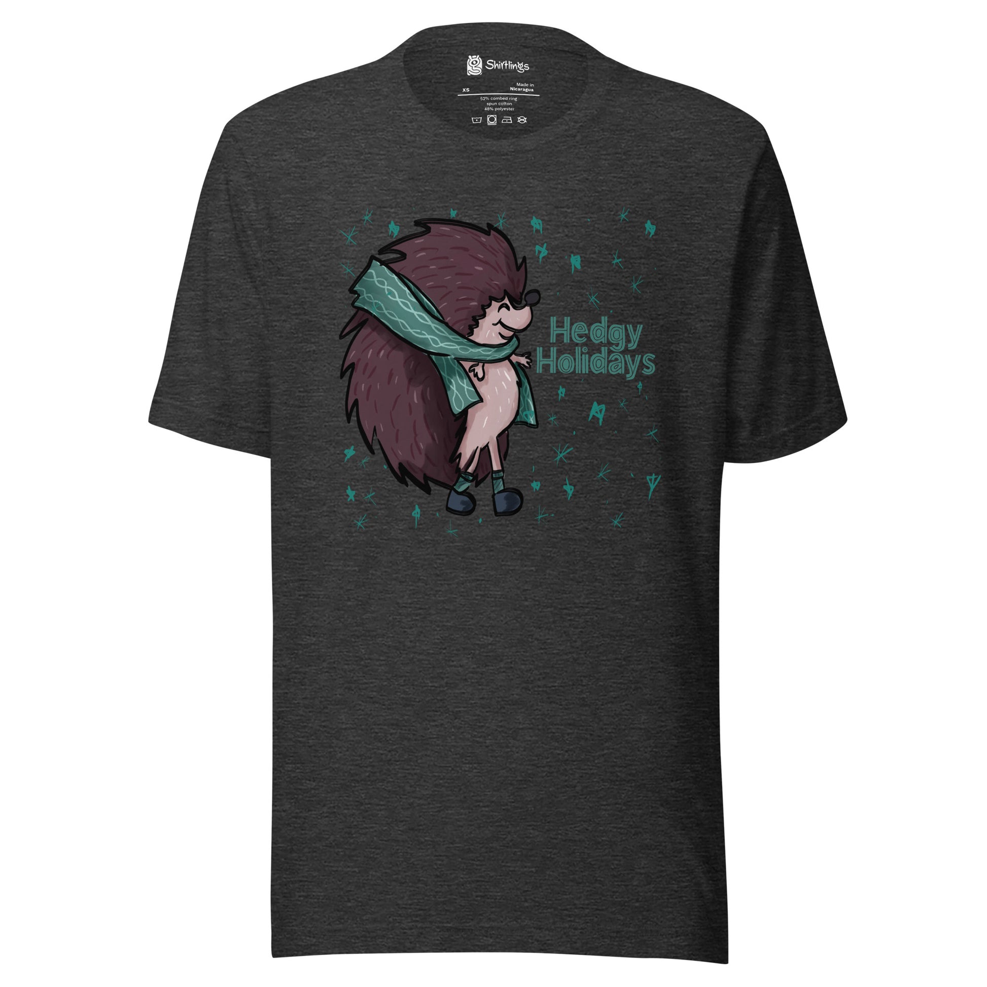 Embrace the hedgehog charm this holiday season with our 'Hedgy Holidays' adult tee. Featuring a cute hedgehog donning a scarf and surrounded by snowflakes, it's your go-to shirt for festive fun.