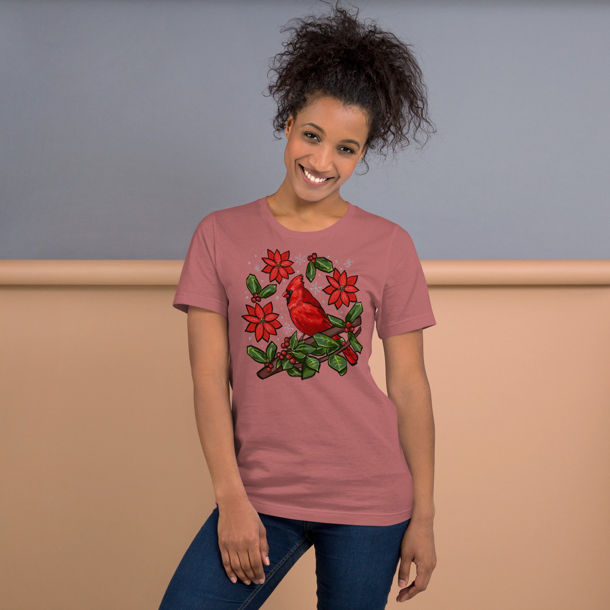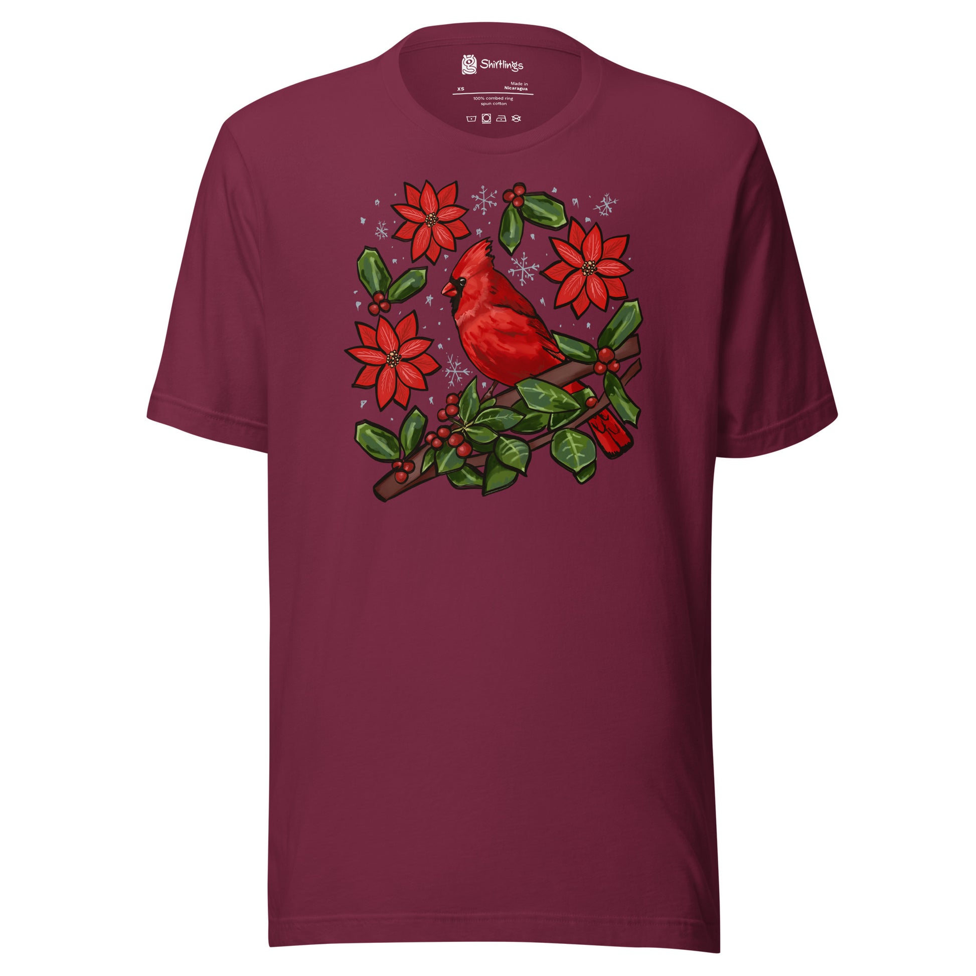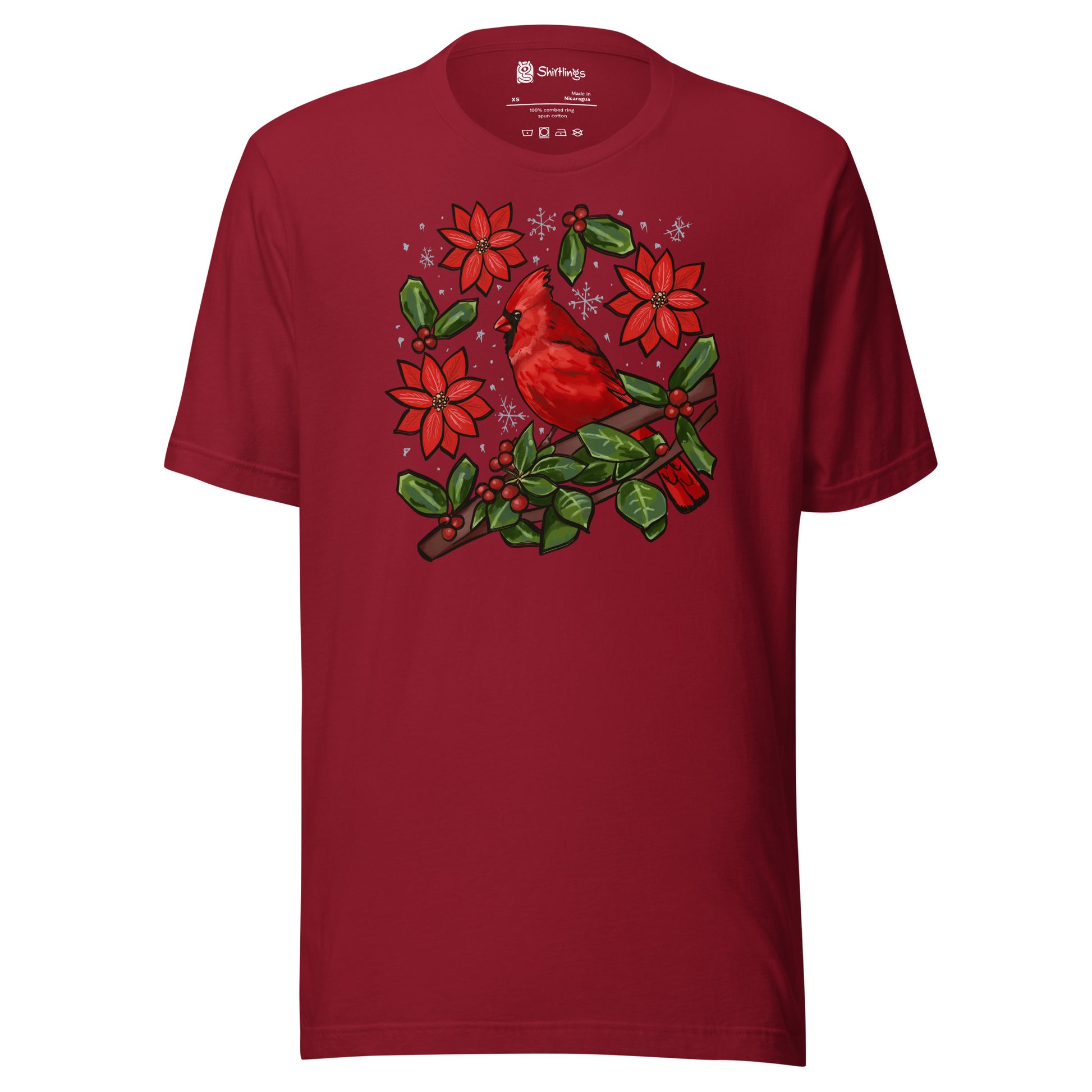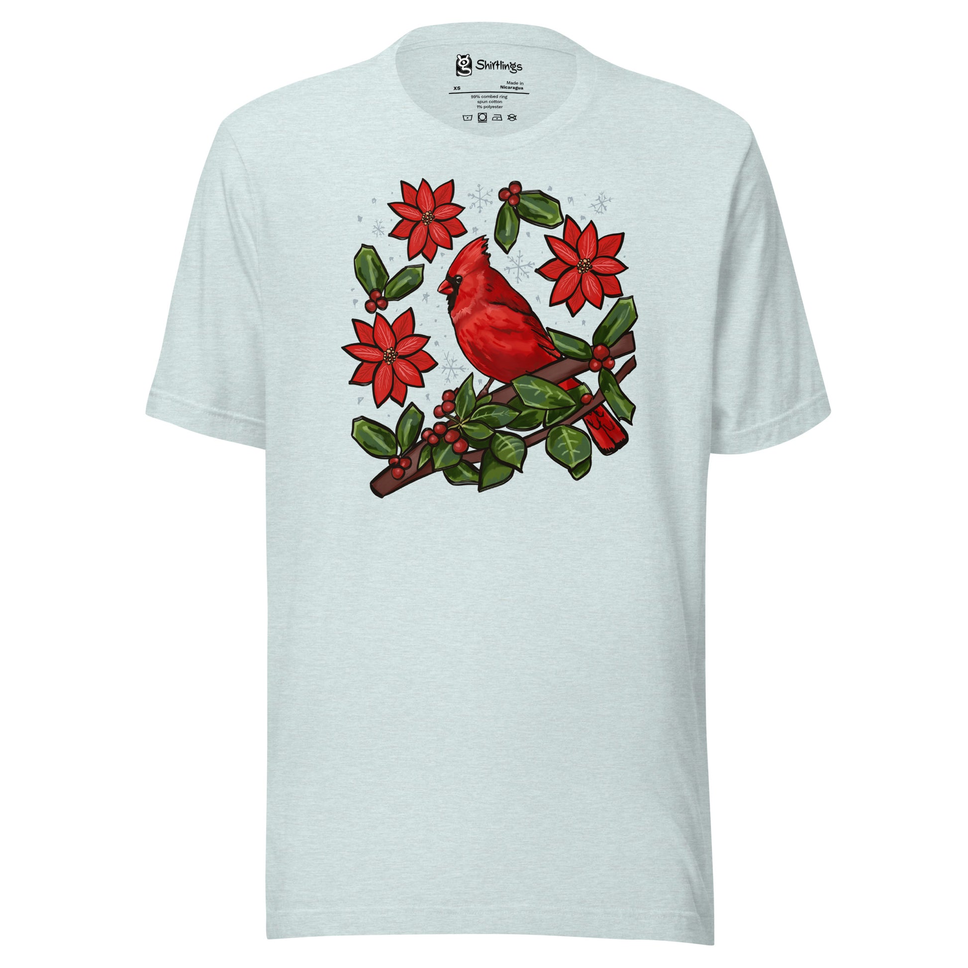 Stand out in our adult tee adorned with a striking cardinal perched among lush leaves and berries. Nature lovers and birdwatchers will flock to this vibrant design.