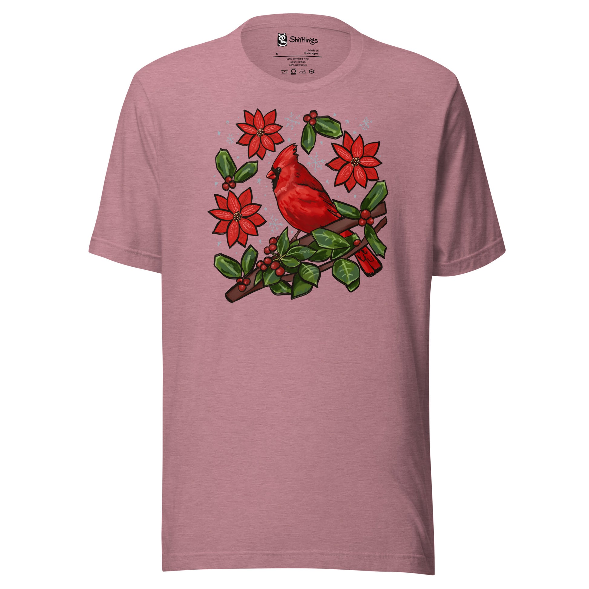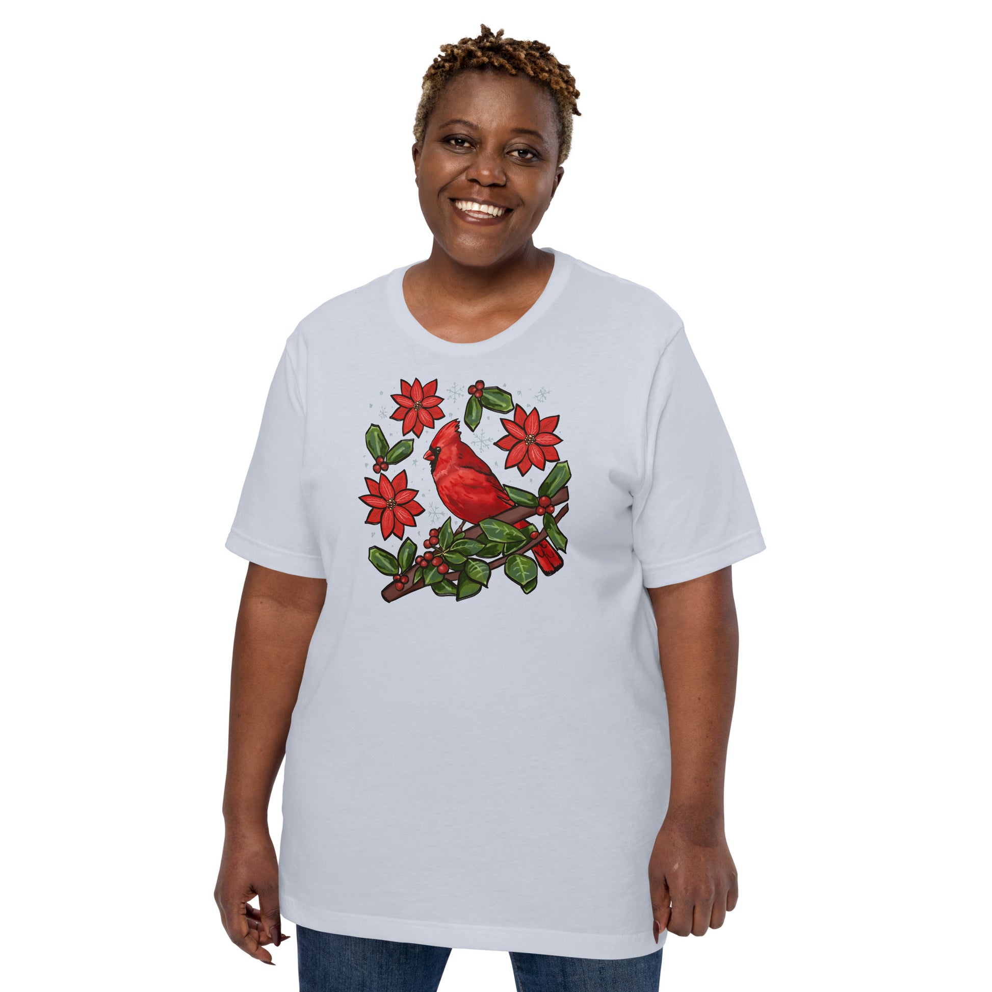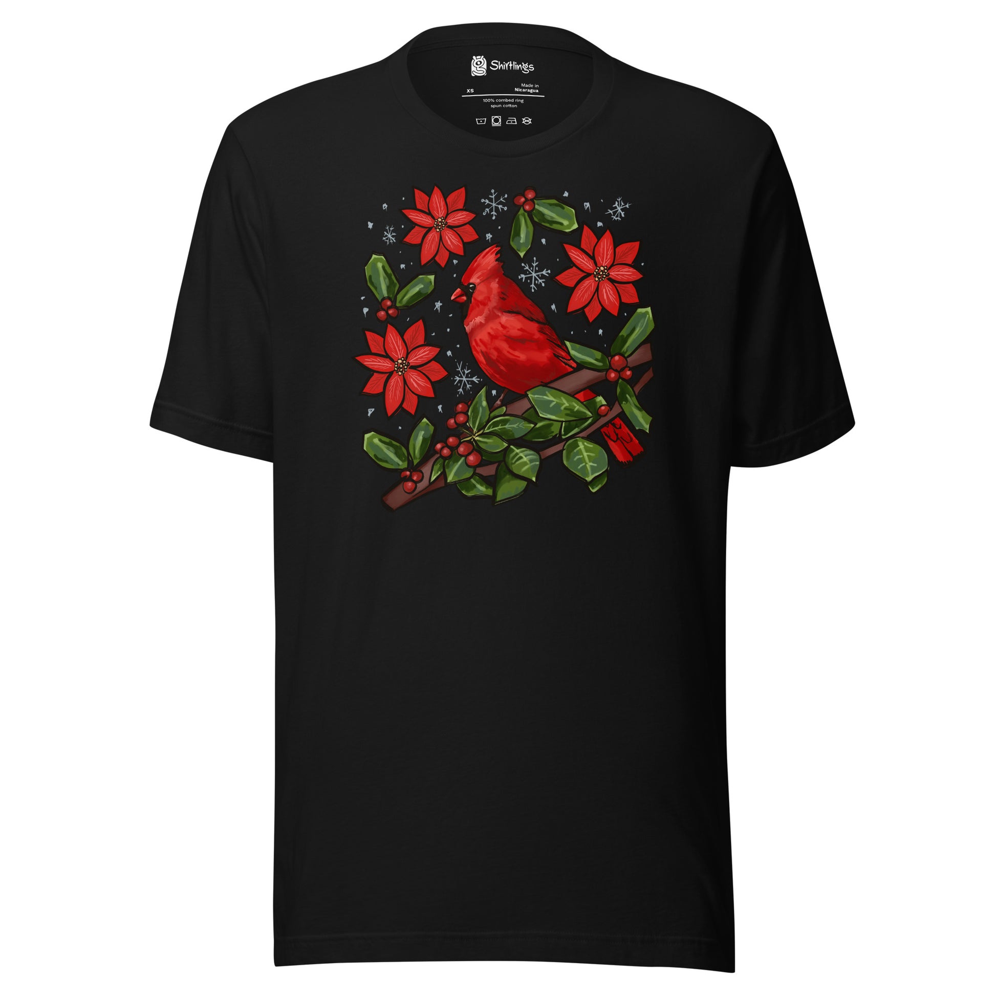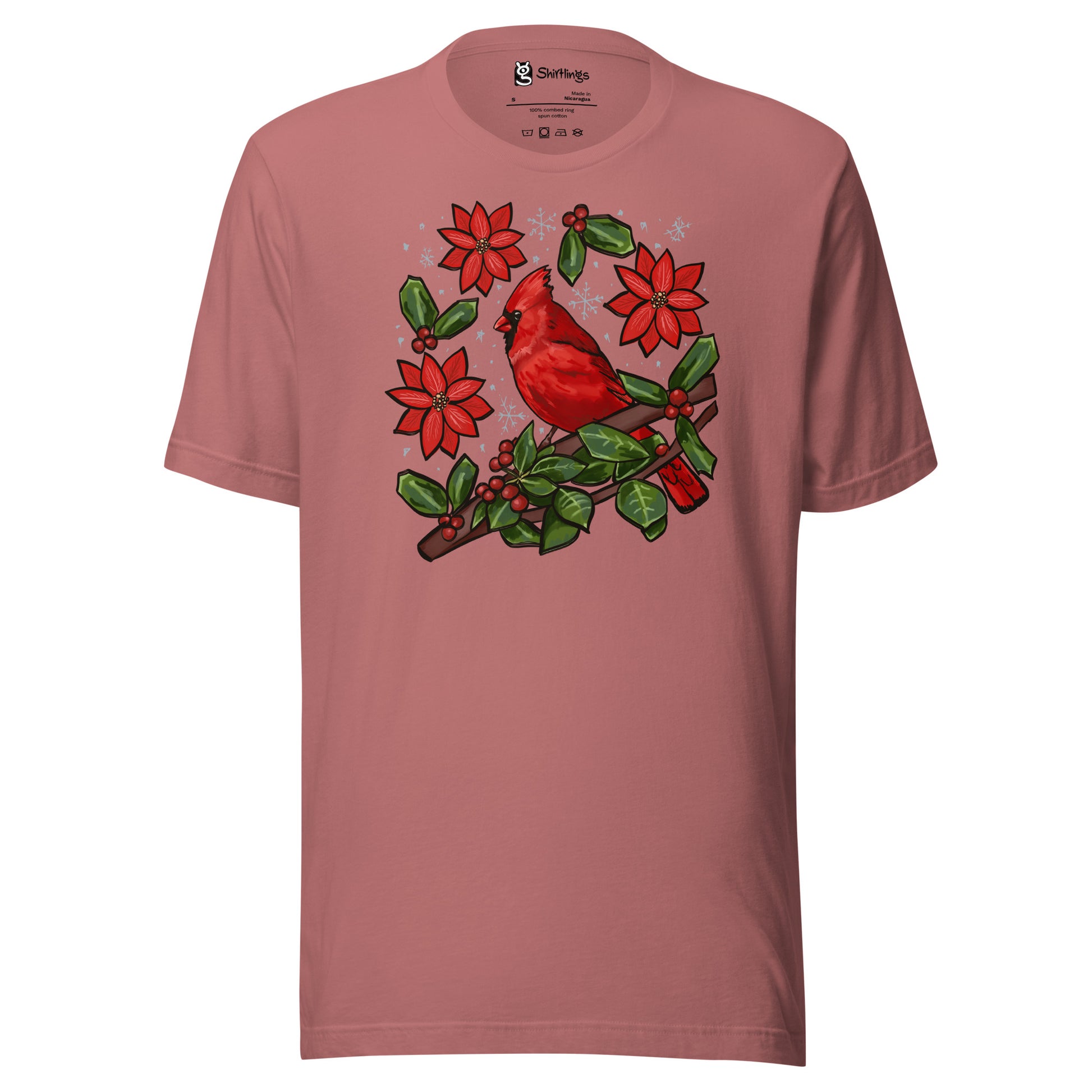 Stand out in our adult tee adorned with a striking cardinal perched among lush leaves and berries. Nature lovers and birdwatchers will flock to this vibrant design.