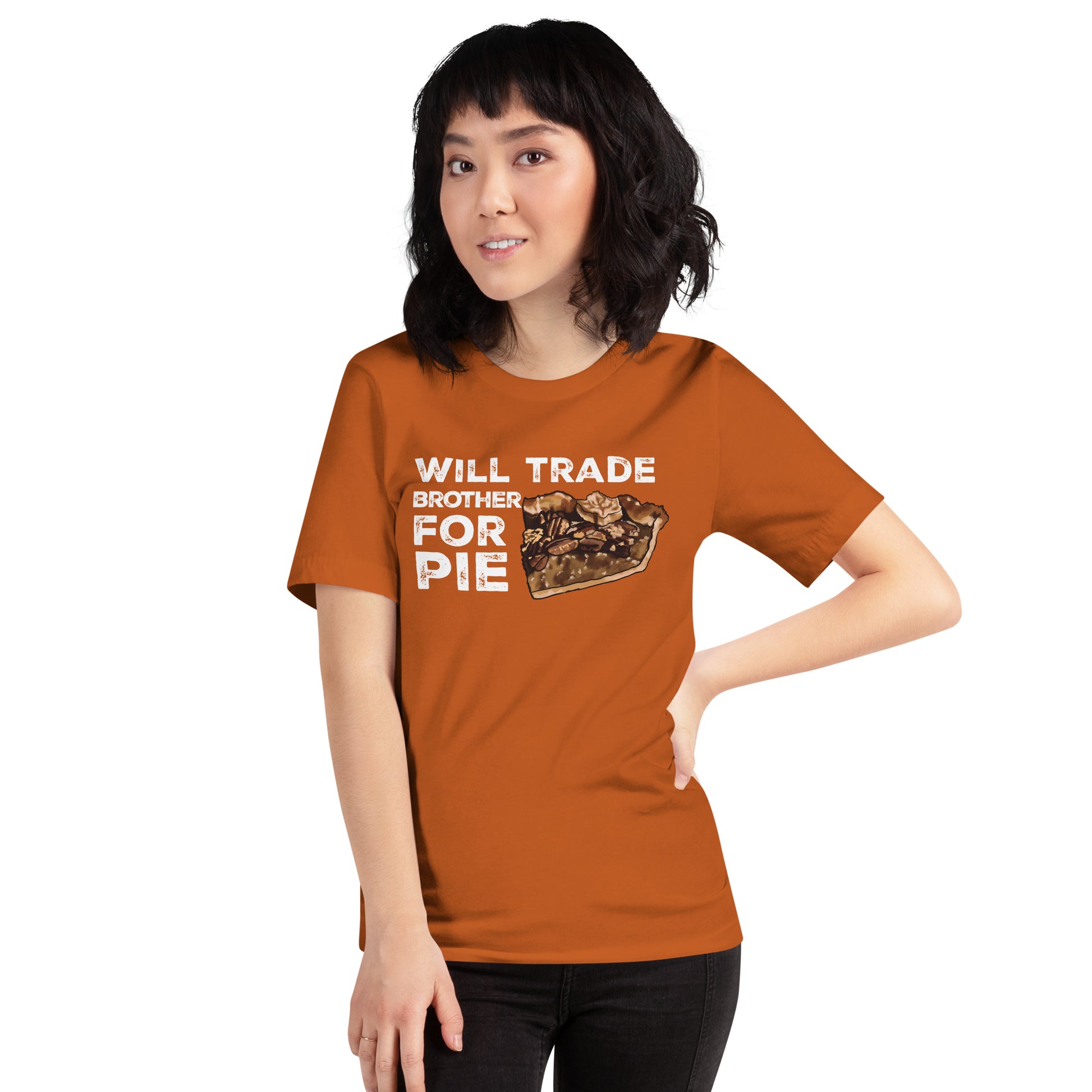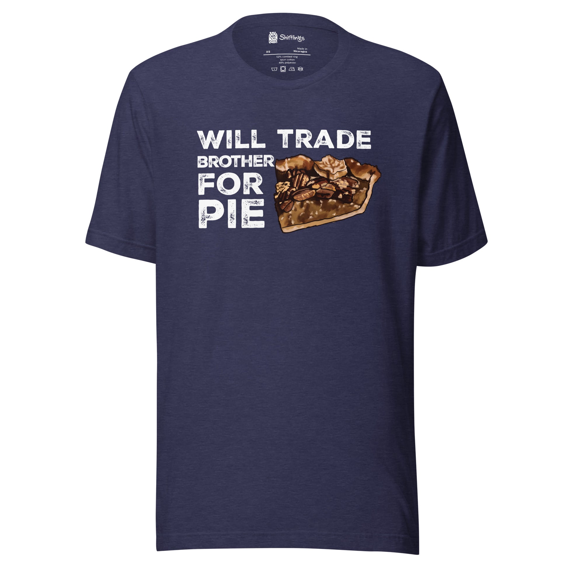 If you're a fan of pecan pie and witty humor, our "Will Trade Brother for Pie" adult tee is a must-have. With a delicious slice of pecan pie as the backdrop, it's a delightful way to express your love for both sweetness and a good laugh.