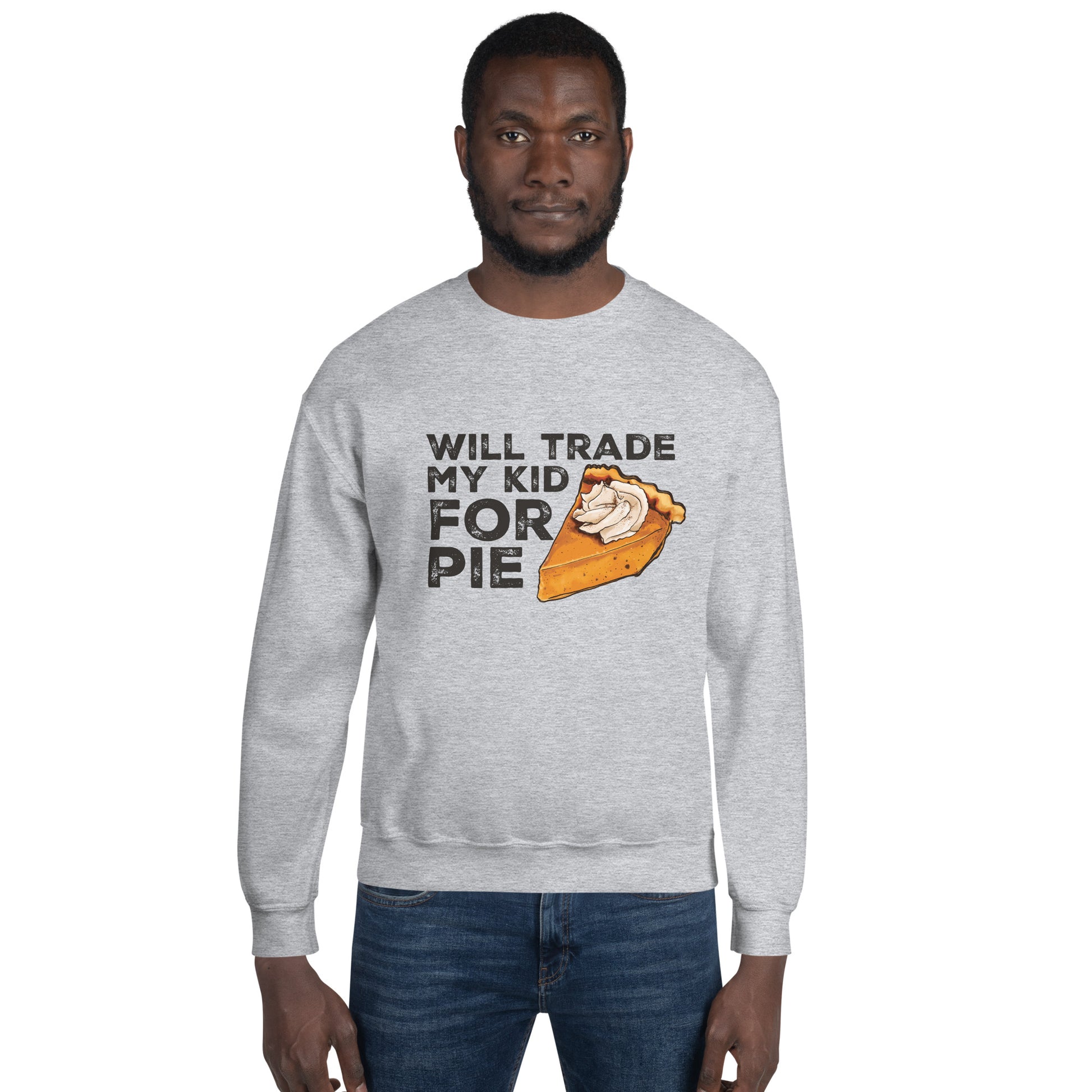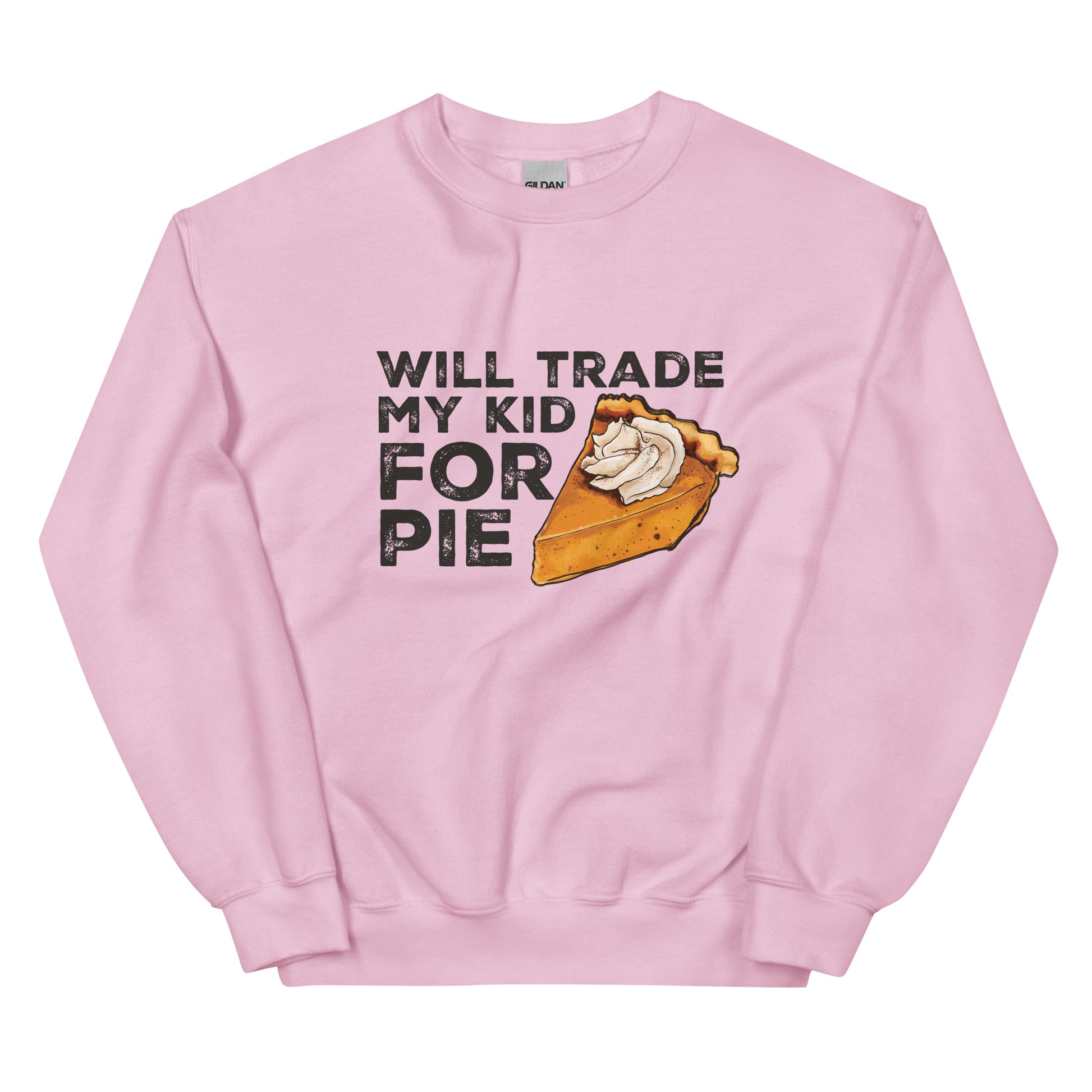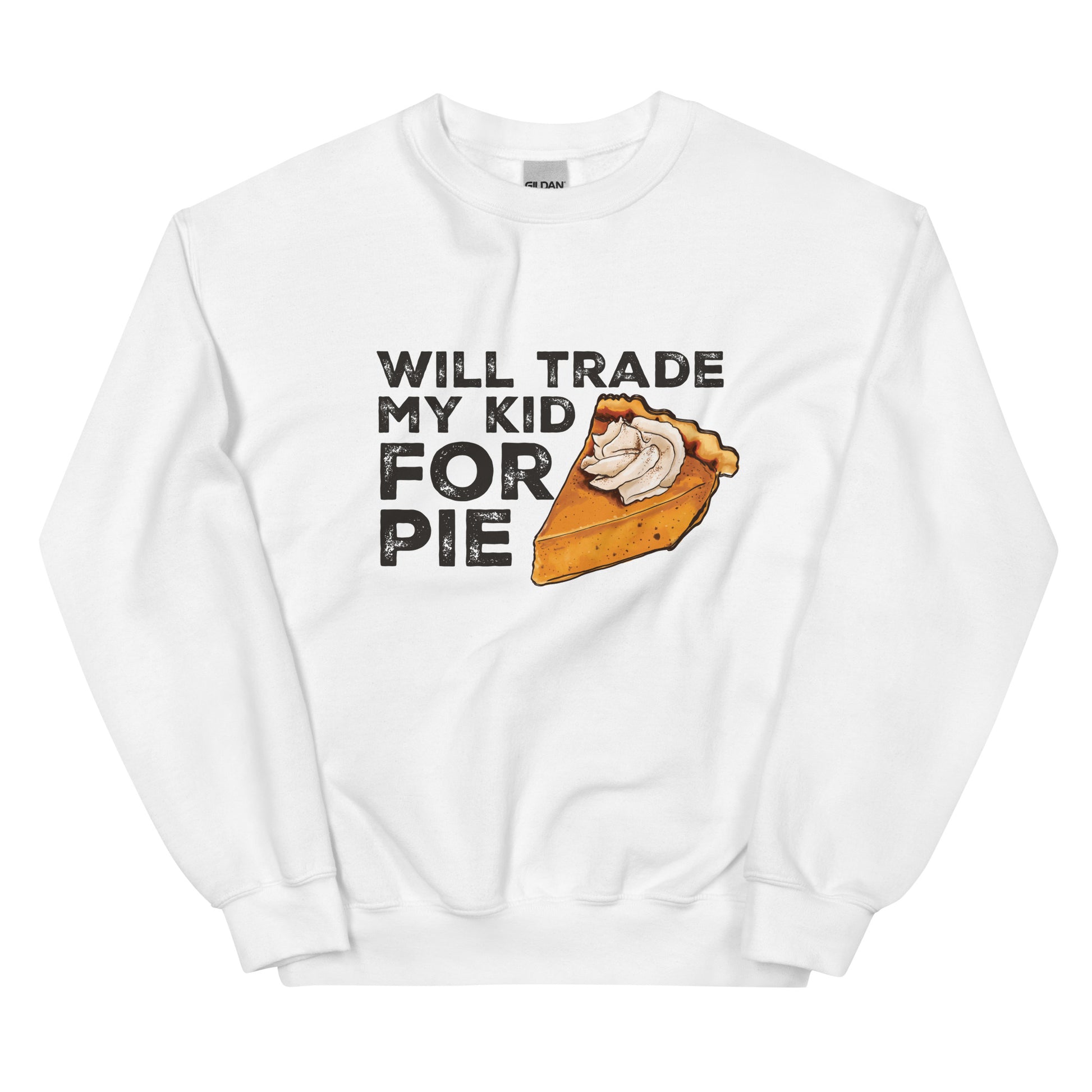 Are you a pie fanatic with a playful sense of humor? Our adult crewneck, adorned with "Will Trade My Kid for Pie" and a tempting pumpkin pie slice, is your perfect choice for showcasing your dessert priorities.