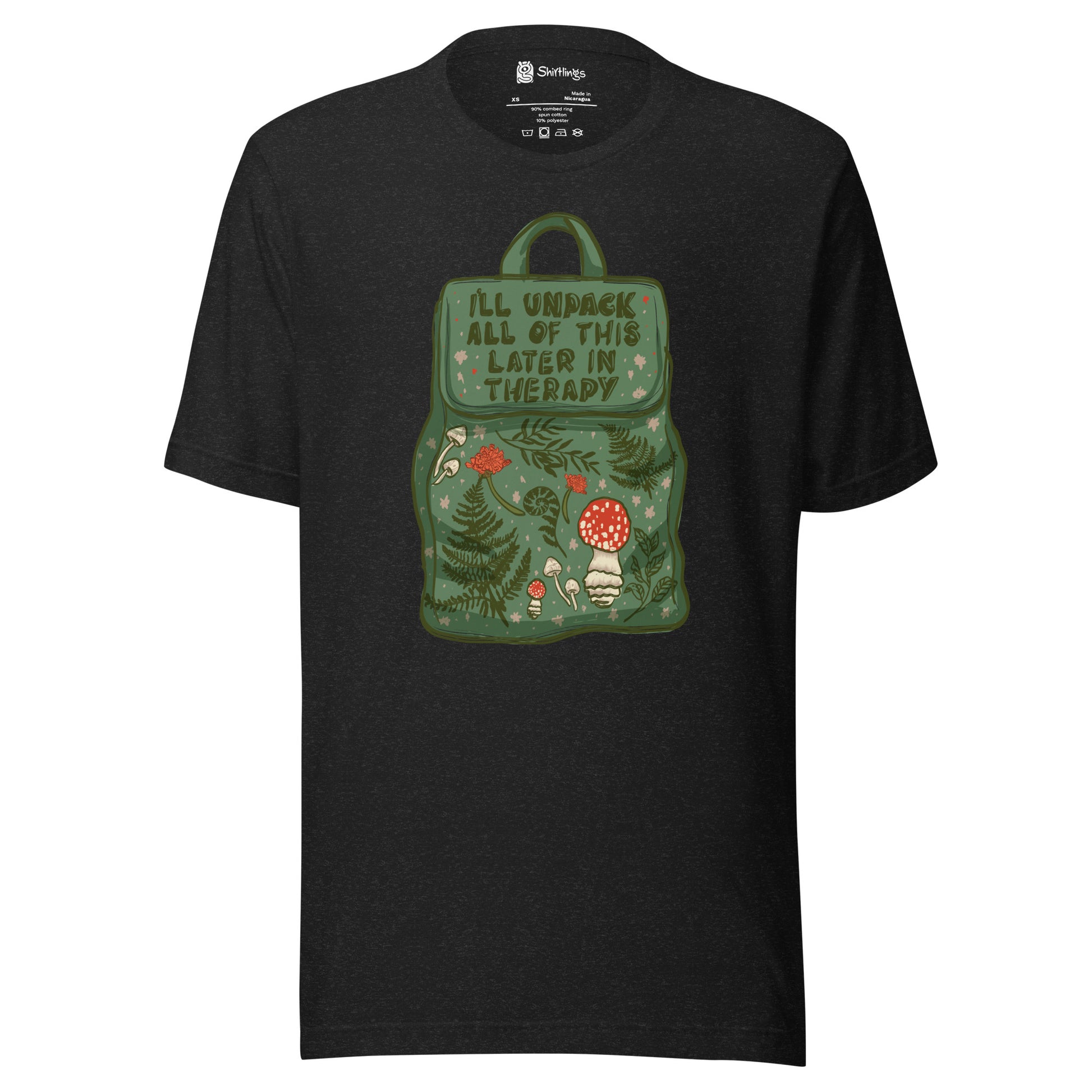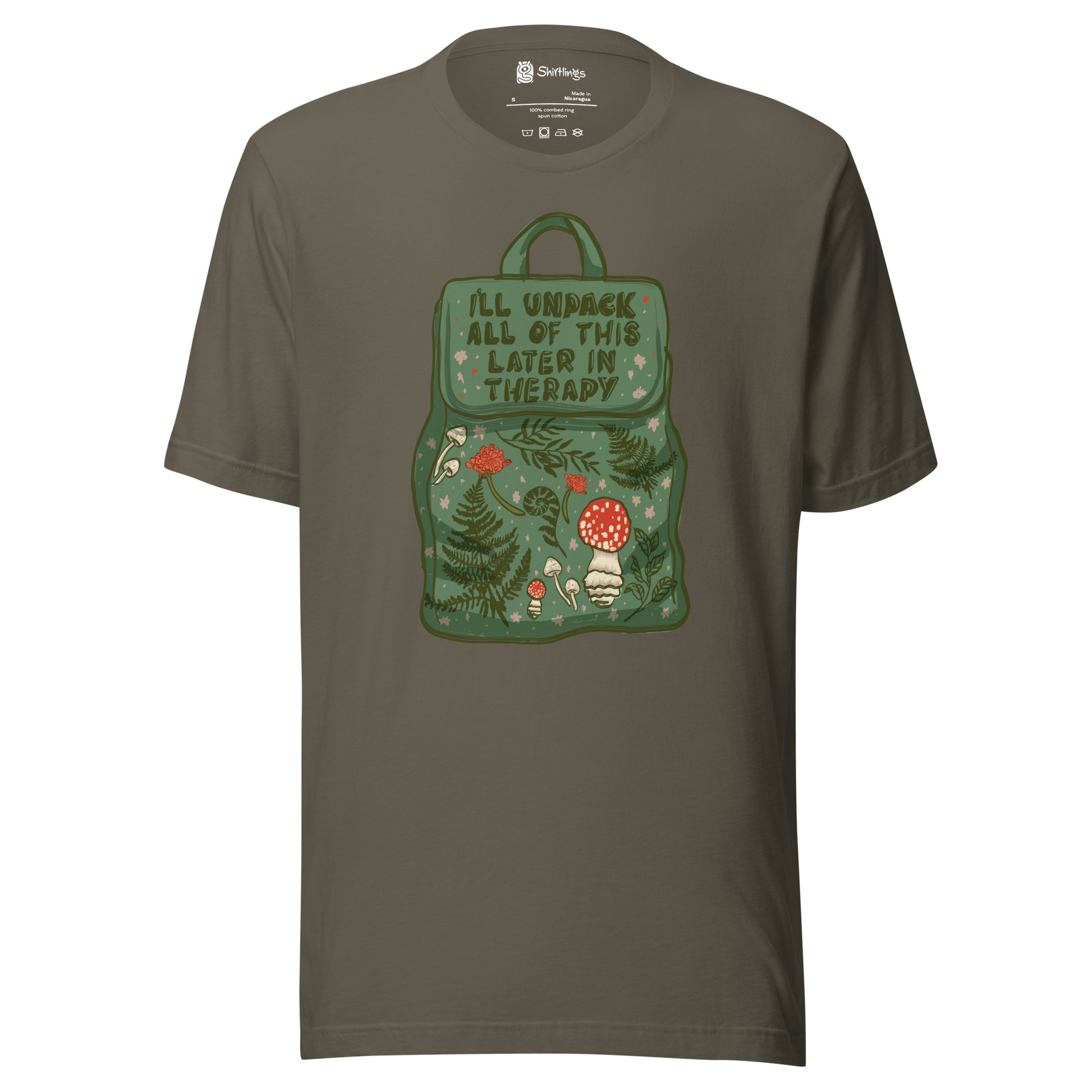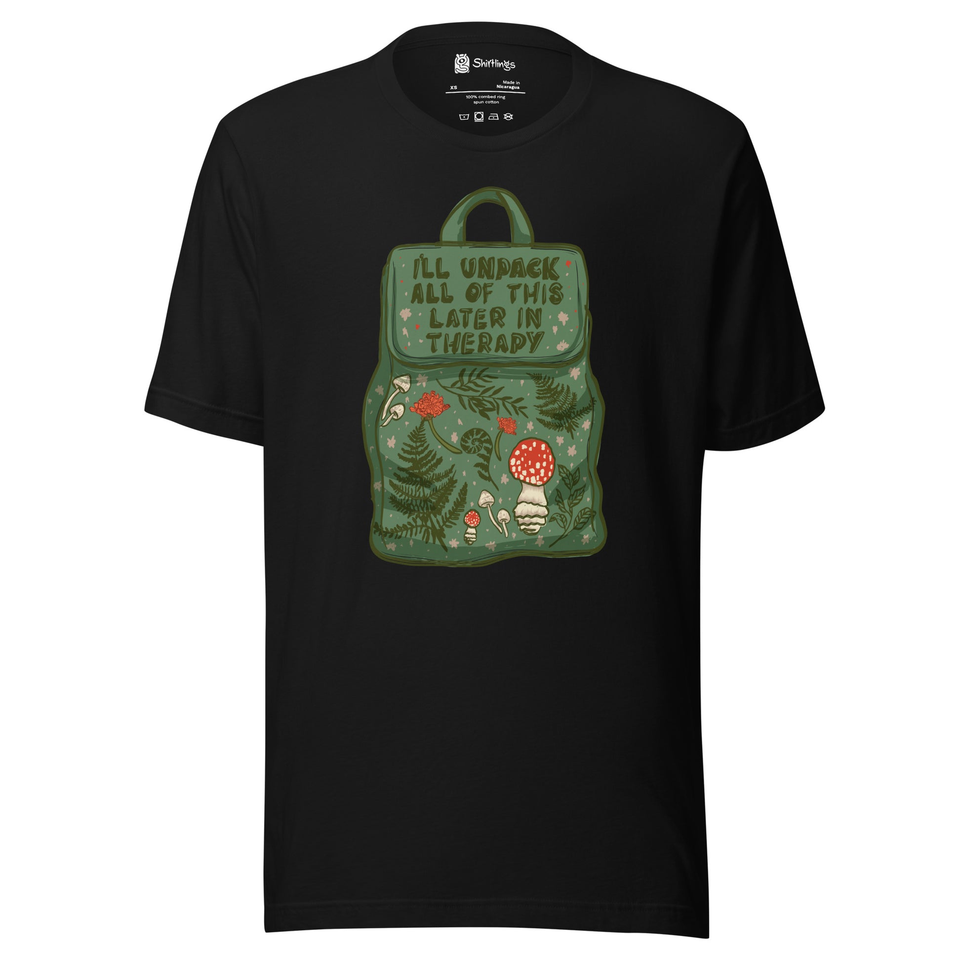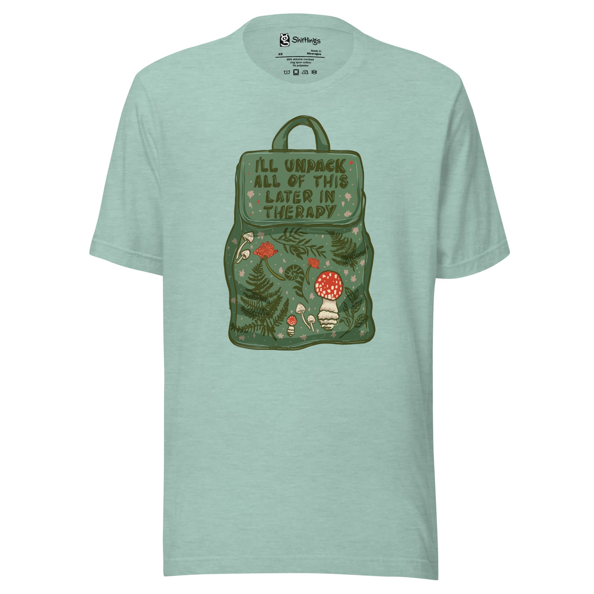 Wear your therapy session on your tee! Our 'Therapeutic Unpacking' design features a green backpack adorned with fern leaves and mushrooms, declaring 'I'll unpack all of this later in therapy.