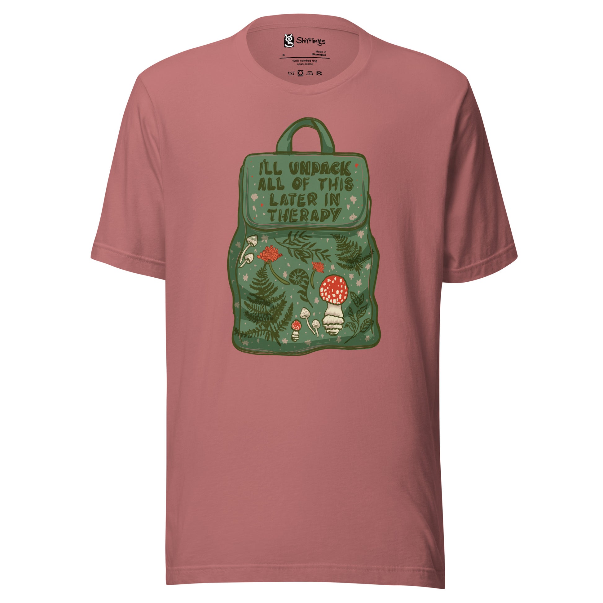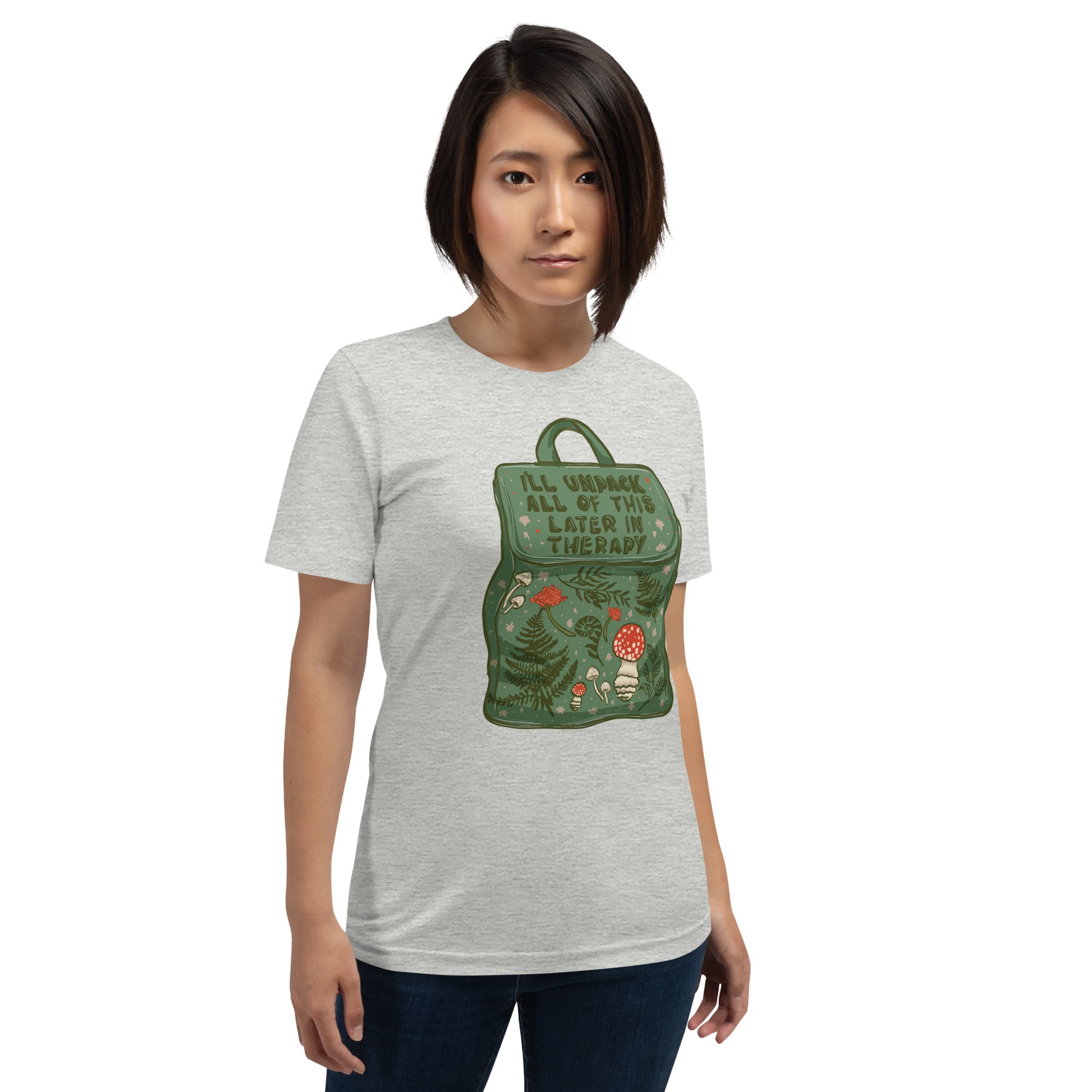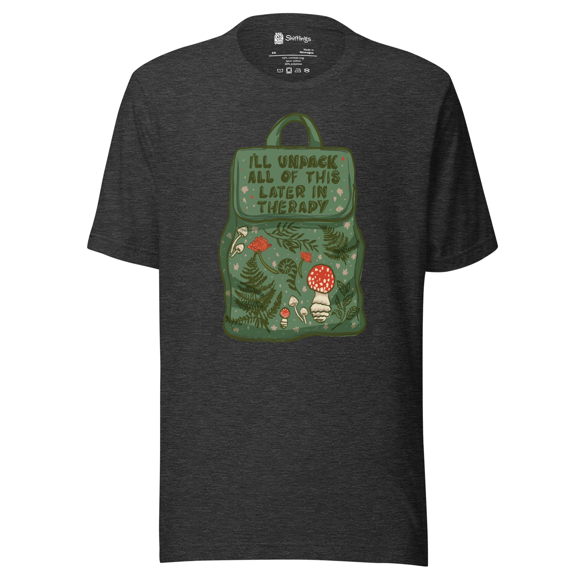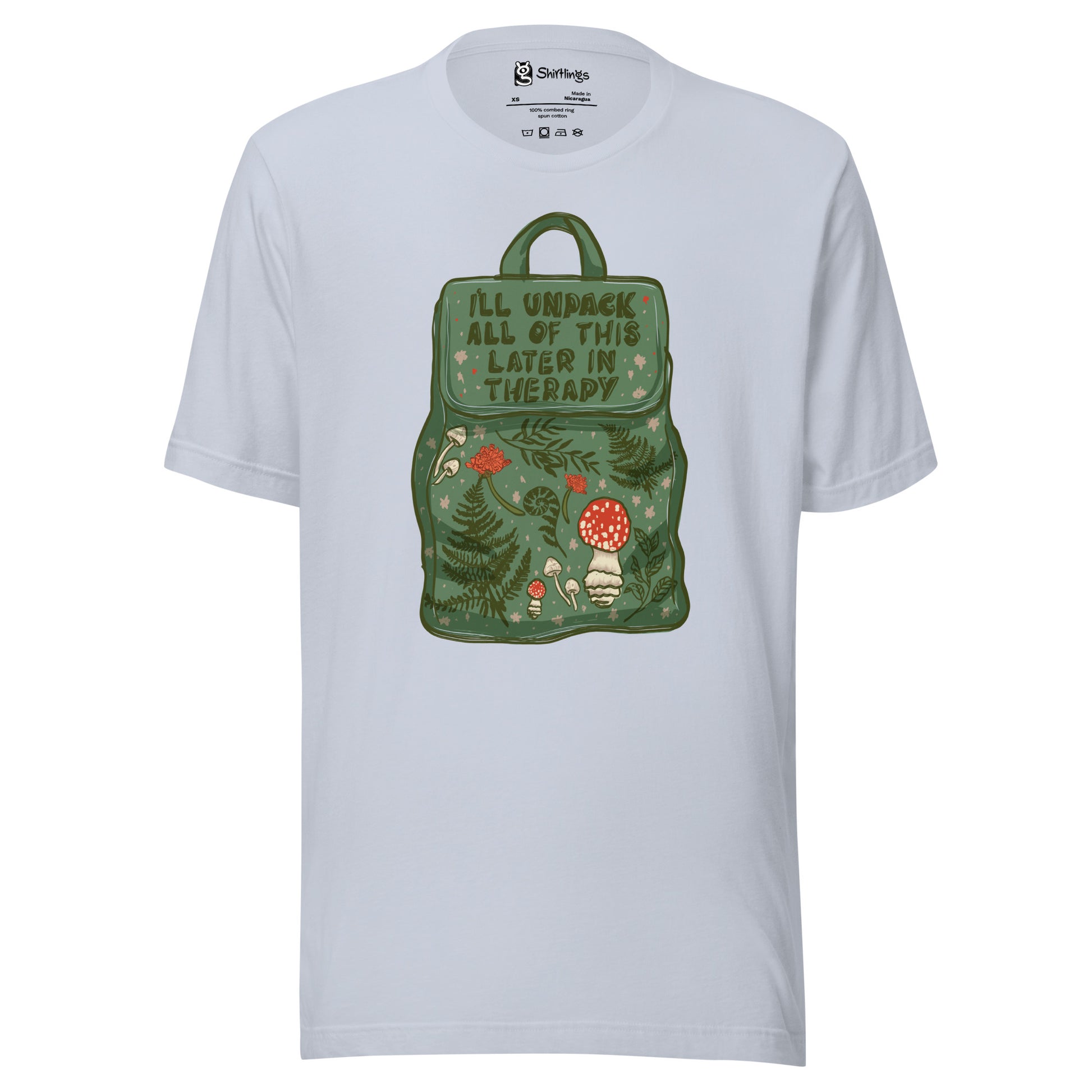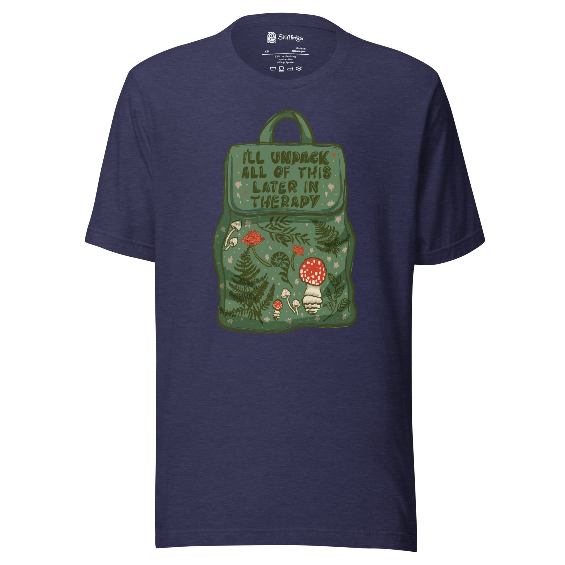 Wear your therapy session on your tee! Our 'Therapeutic Unpacking' design features a green backpack adorned with fern leaves and mushrooms, declaring 'I'll unpack all of this later in therapy.