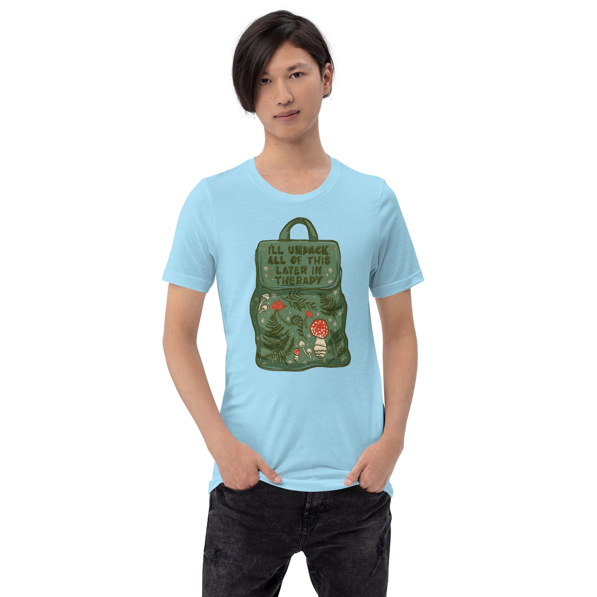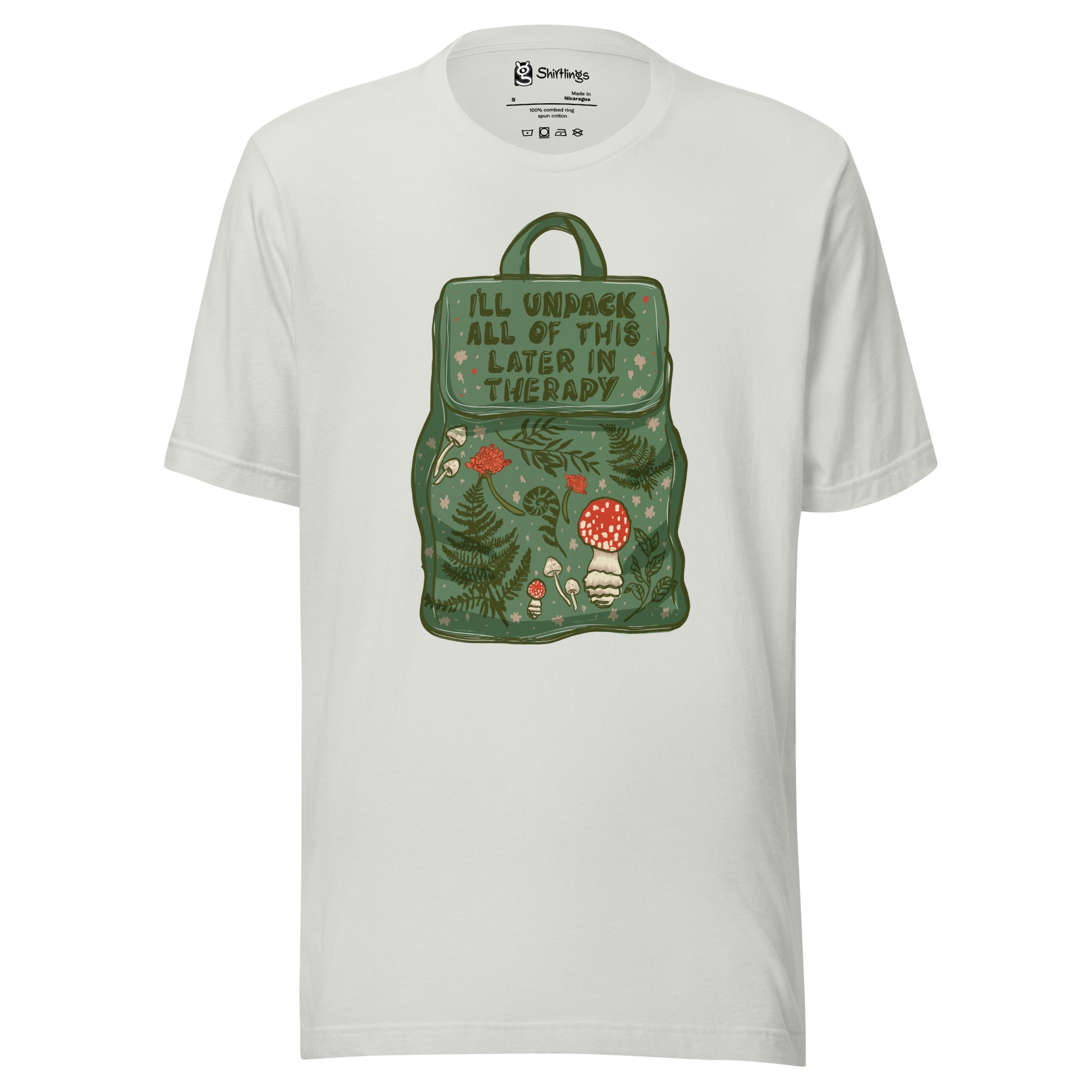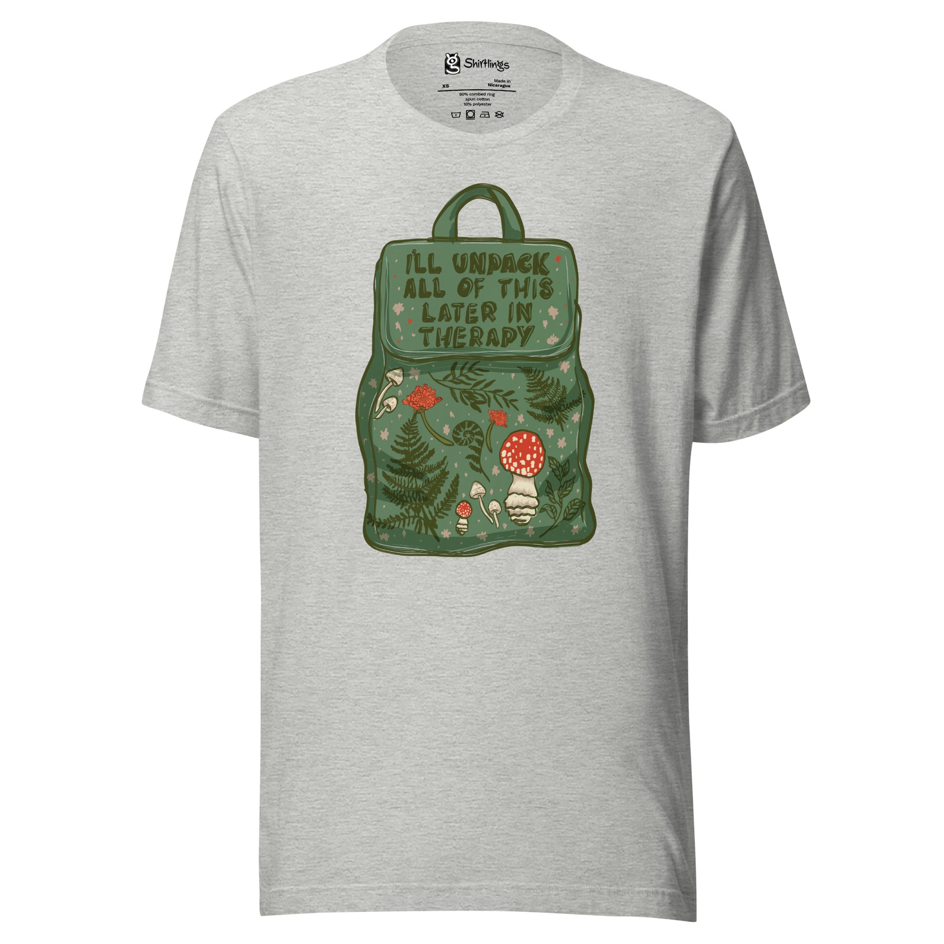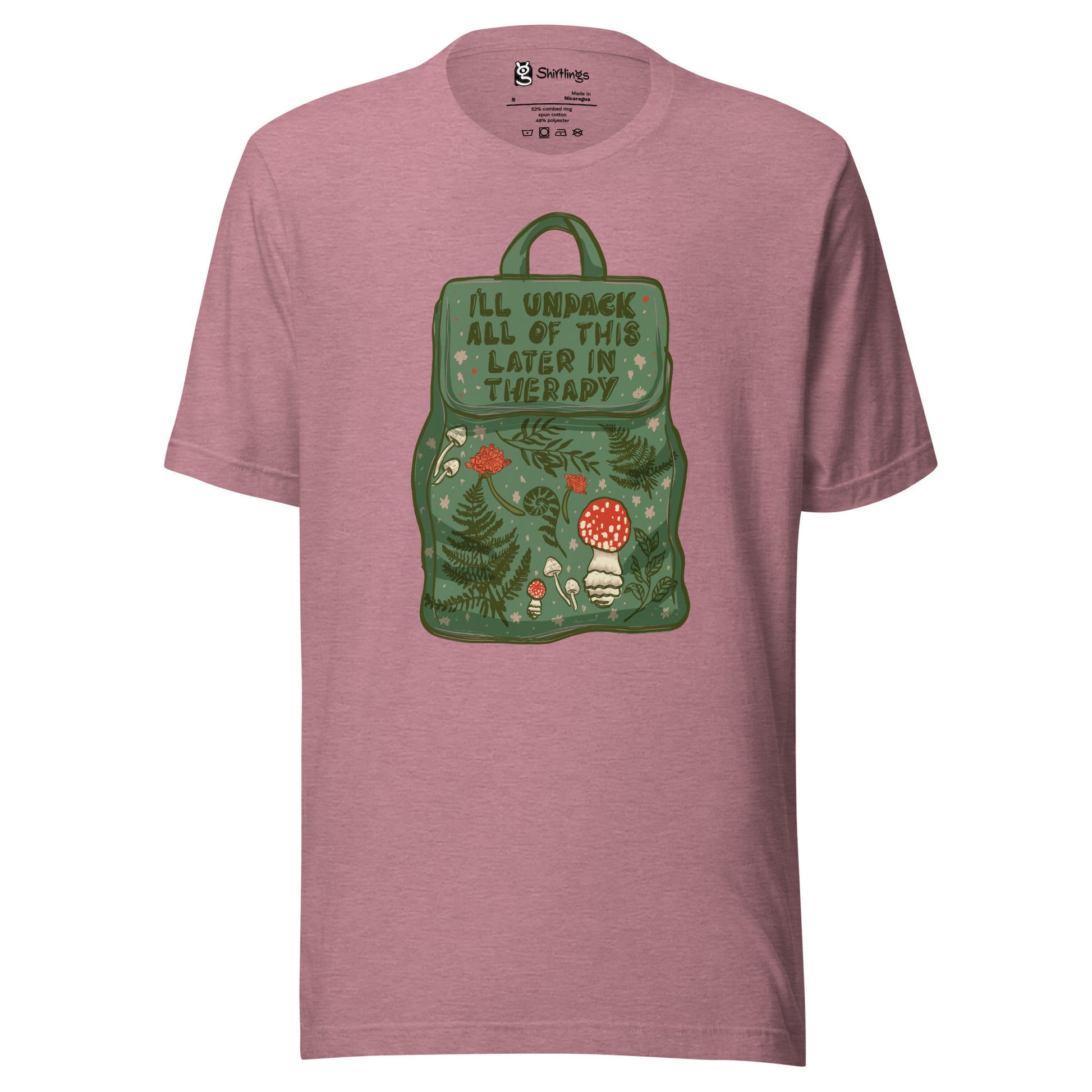 Wear your therapy session on your tee! Our 'Therapeutic Unpacking' design features a green backpack adorned with fern leaves and mushrooms, declaring 'I'll unpack all of this later in therapy.