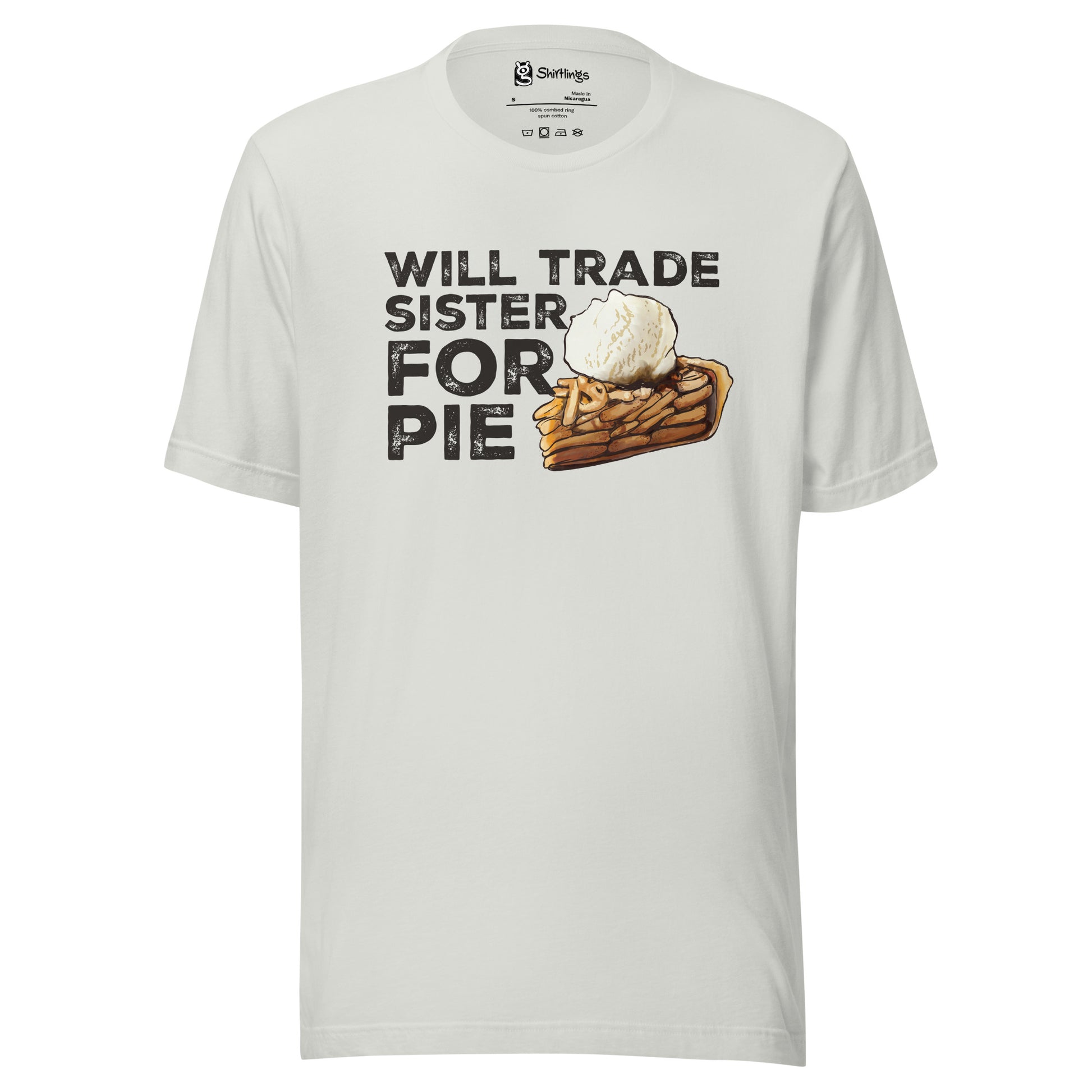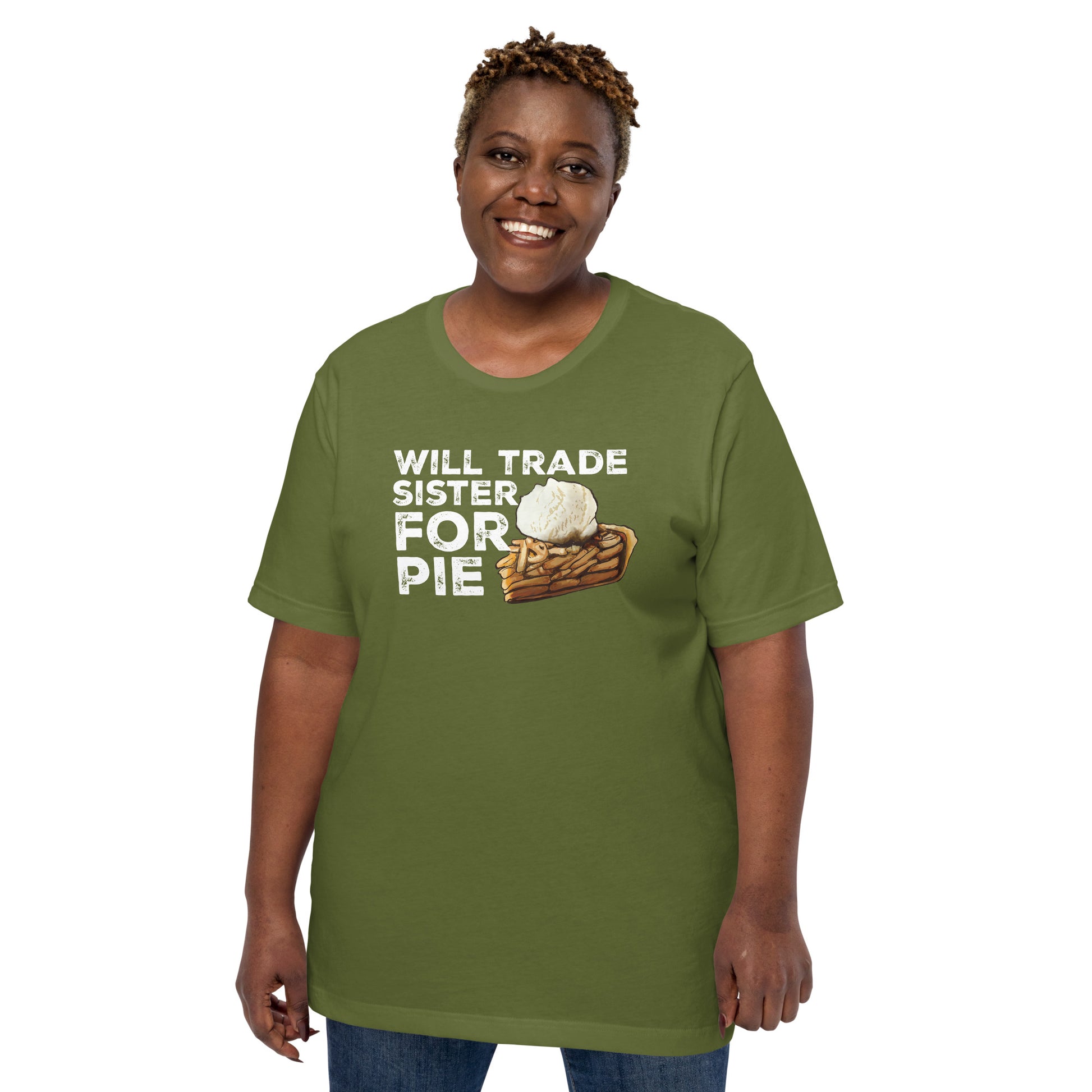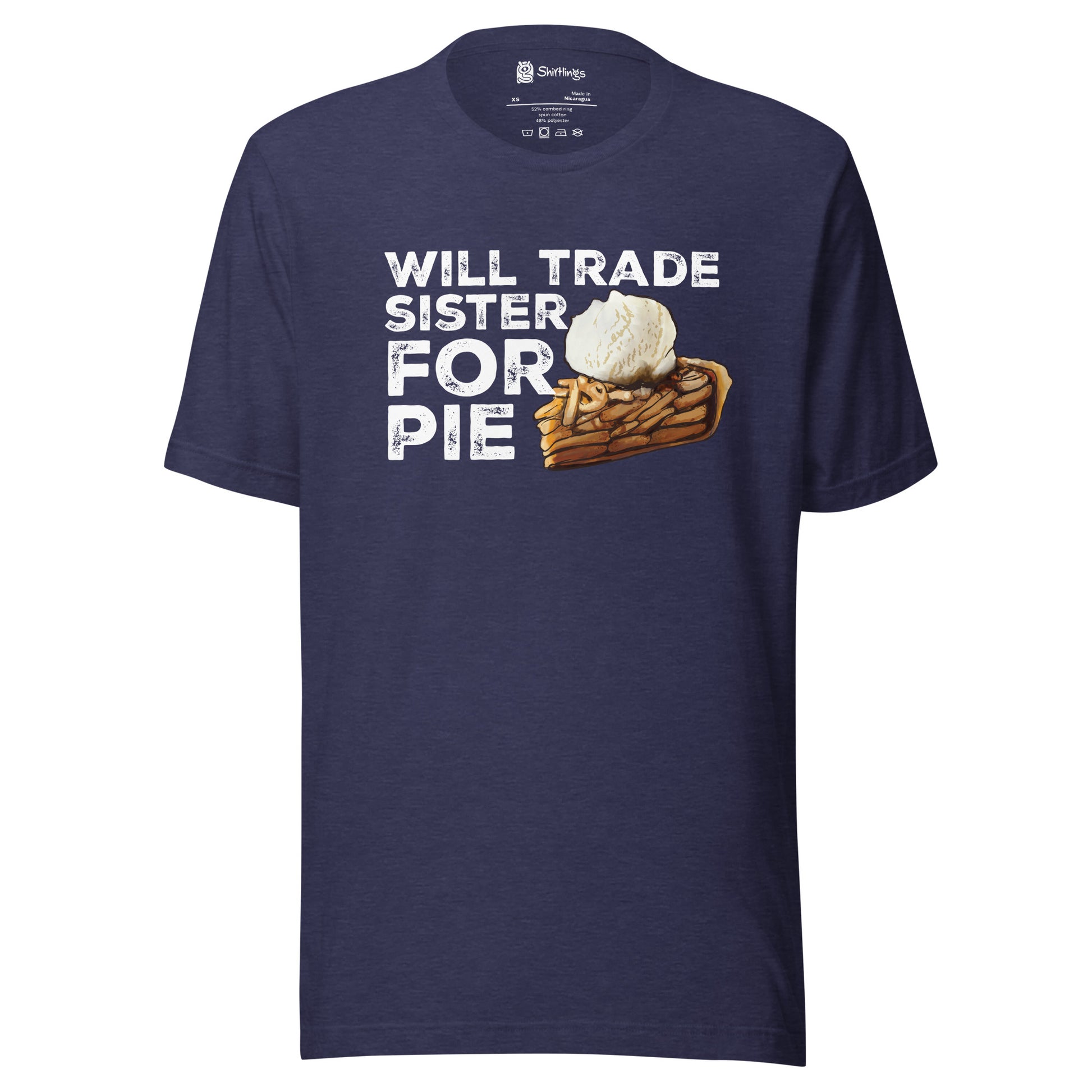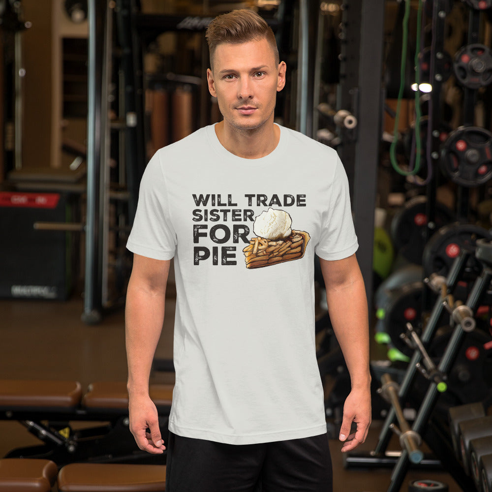 "Trade Sister for Pie!" Proclaim your love for apple pie with humor. Our adult tee, featuring a tempting slice of apple pie, lets you express your dessert cravings in a lighthearted way.
