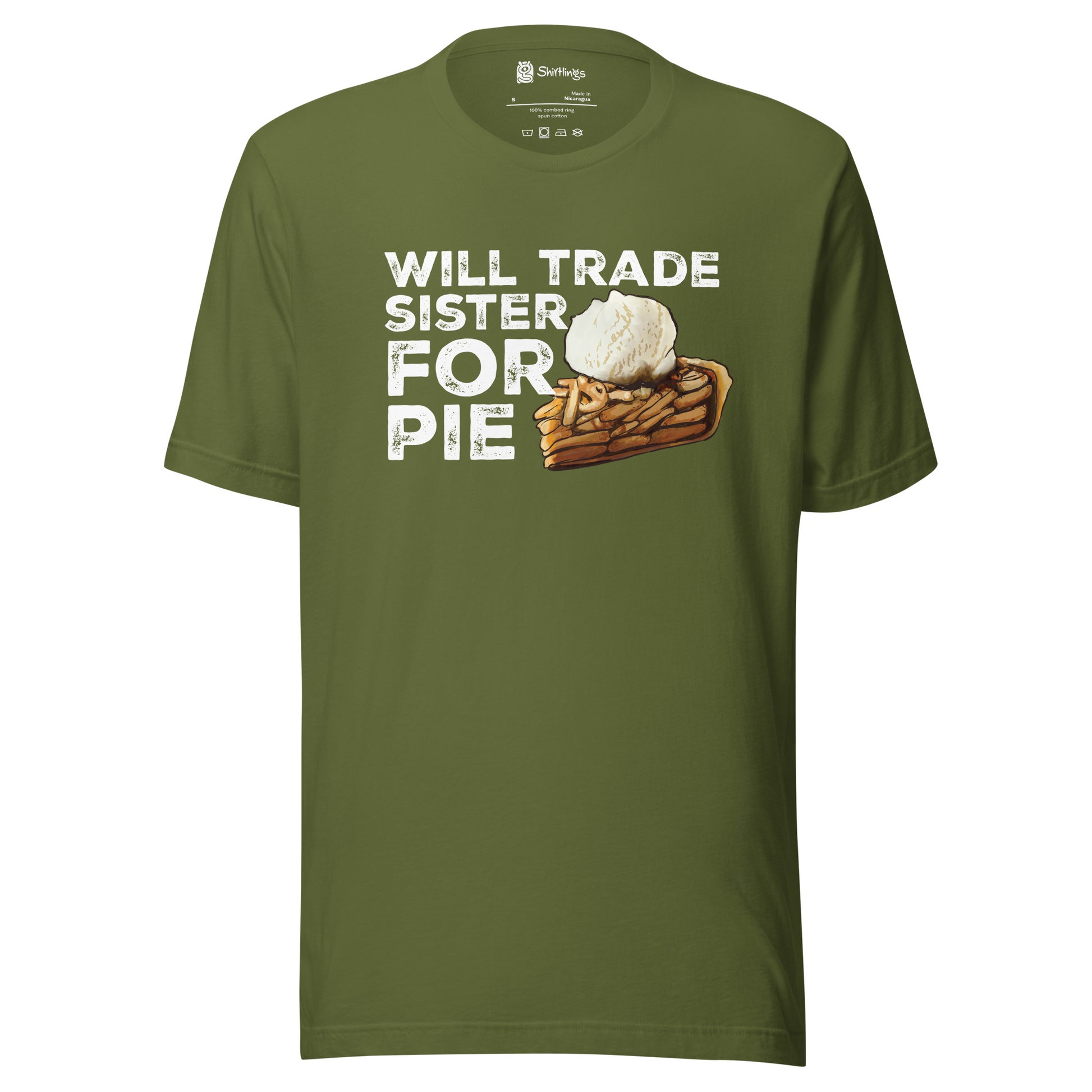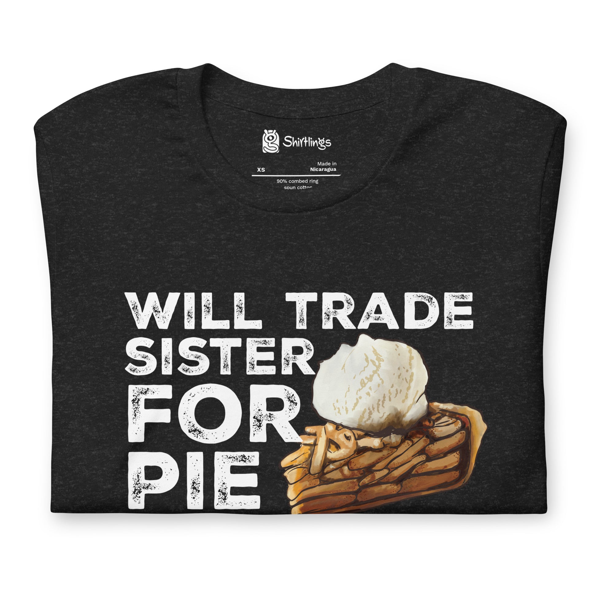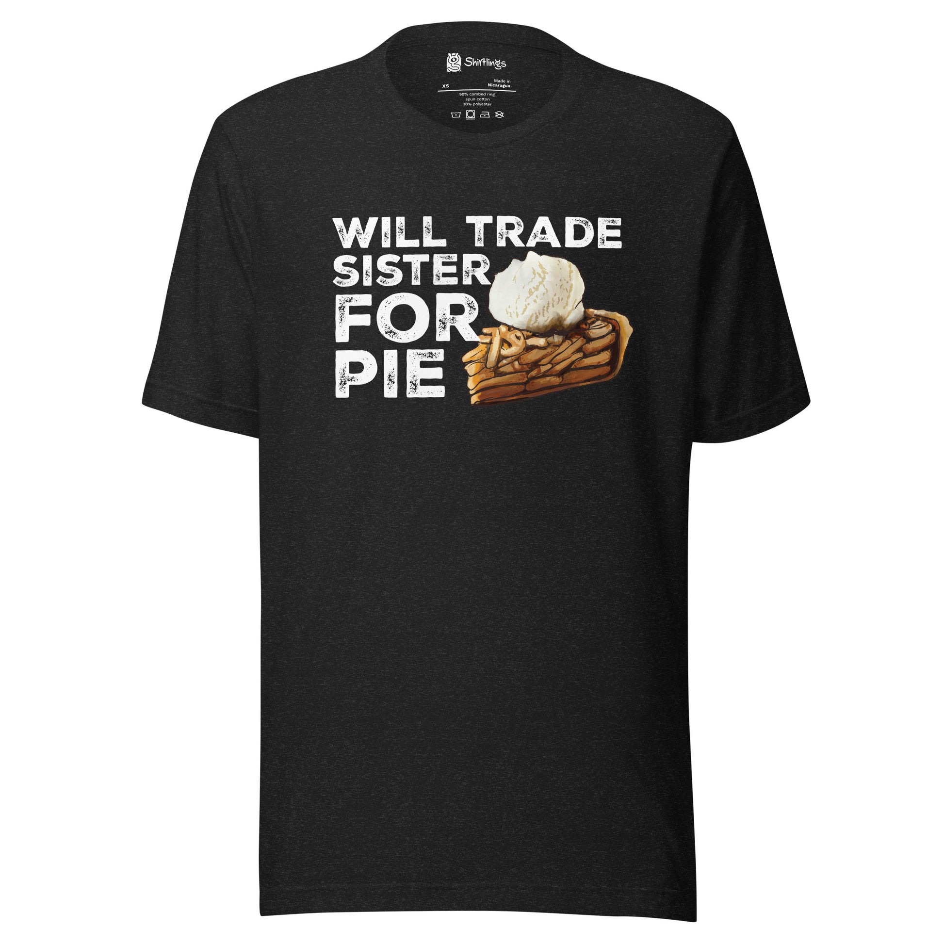 "Trade Sister for Pie!" Proclaim your love for apple pie with humor. Our adult tee, featuring a tempting slice of apple pie, lets you express your dessert cravings in a lighthearted way.
