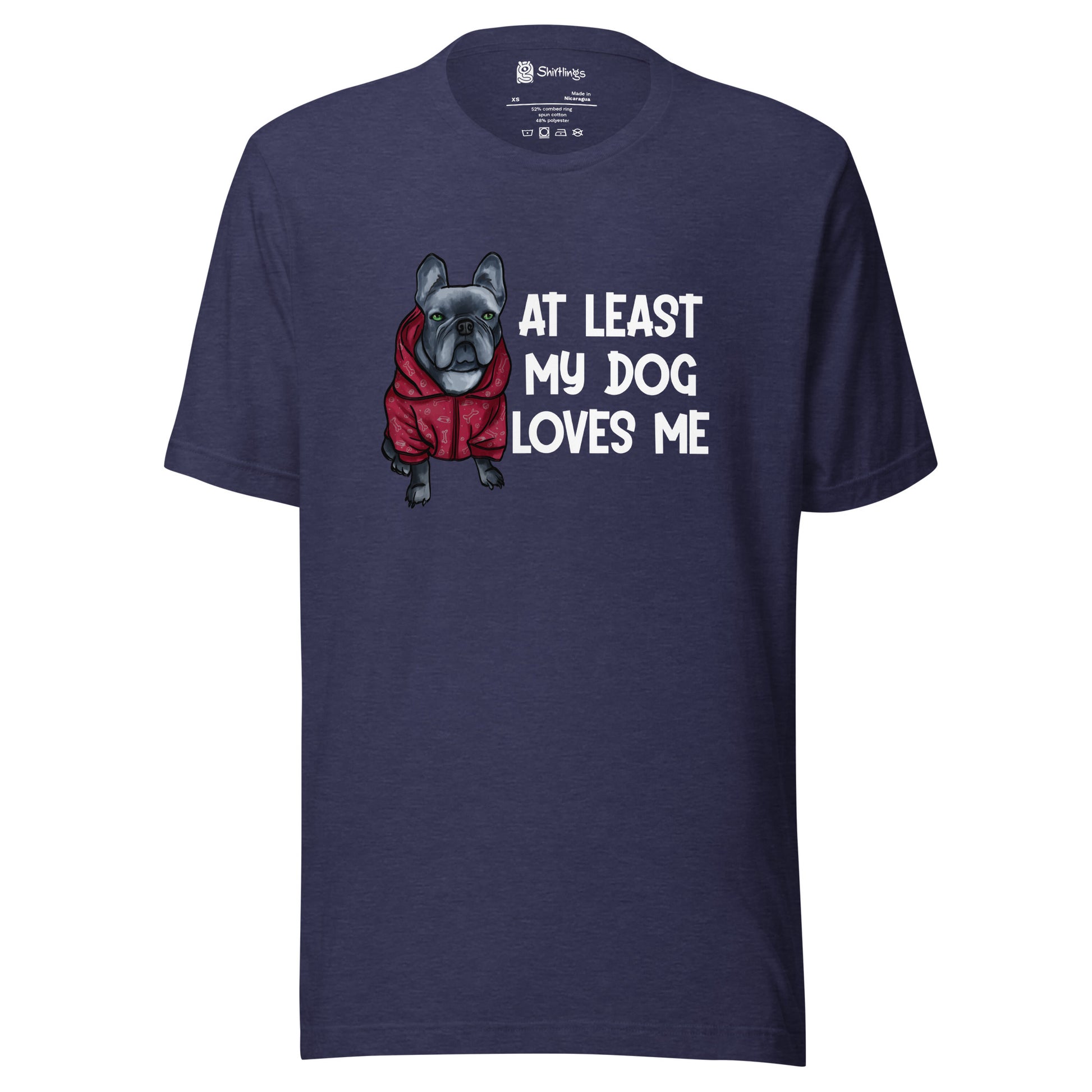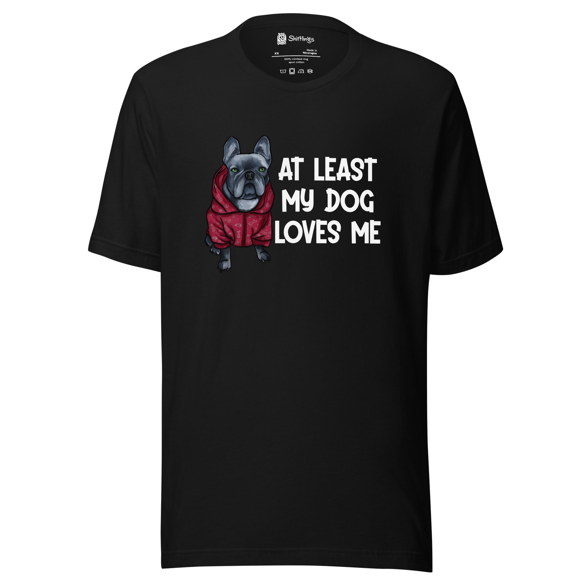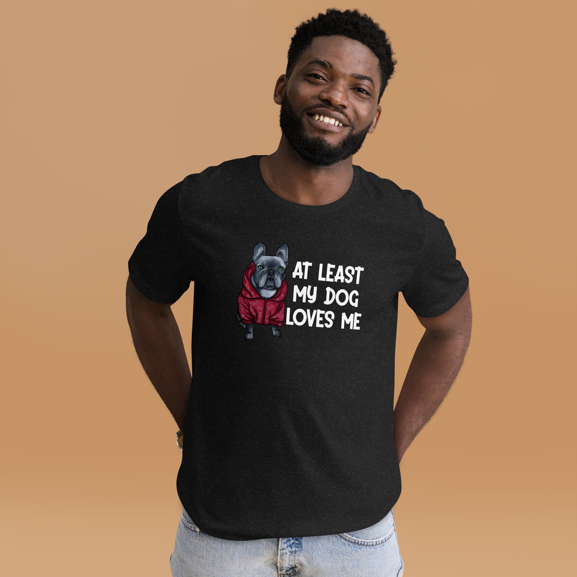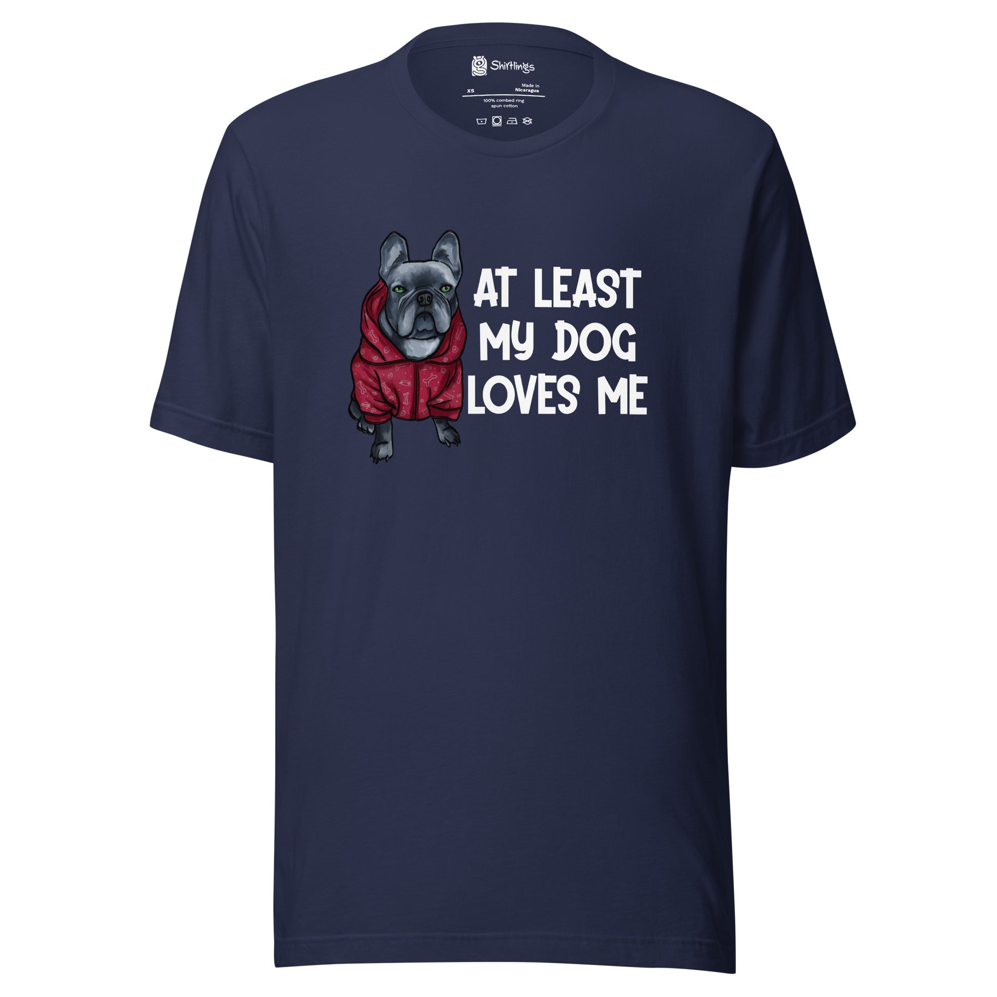 Embrace the unconditional love of your furry friend with our 'At Least My Dog Loves Me' tee, starring an irresistibly cute French Bulldog in a hoodie.
