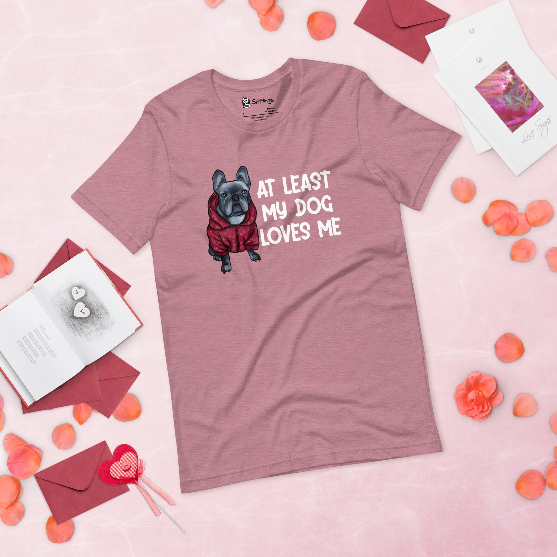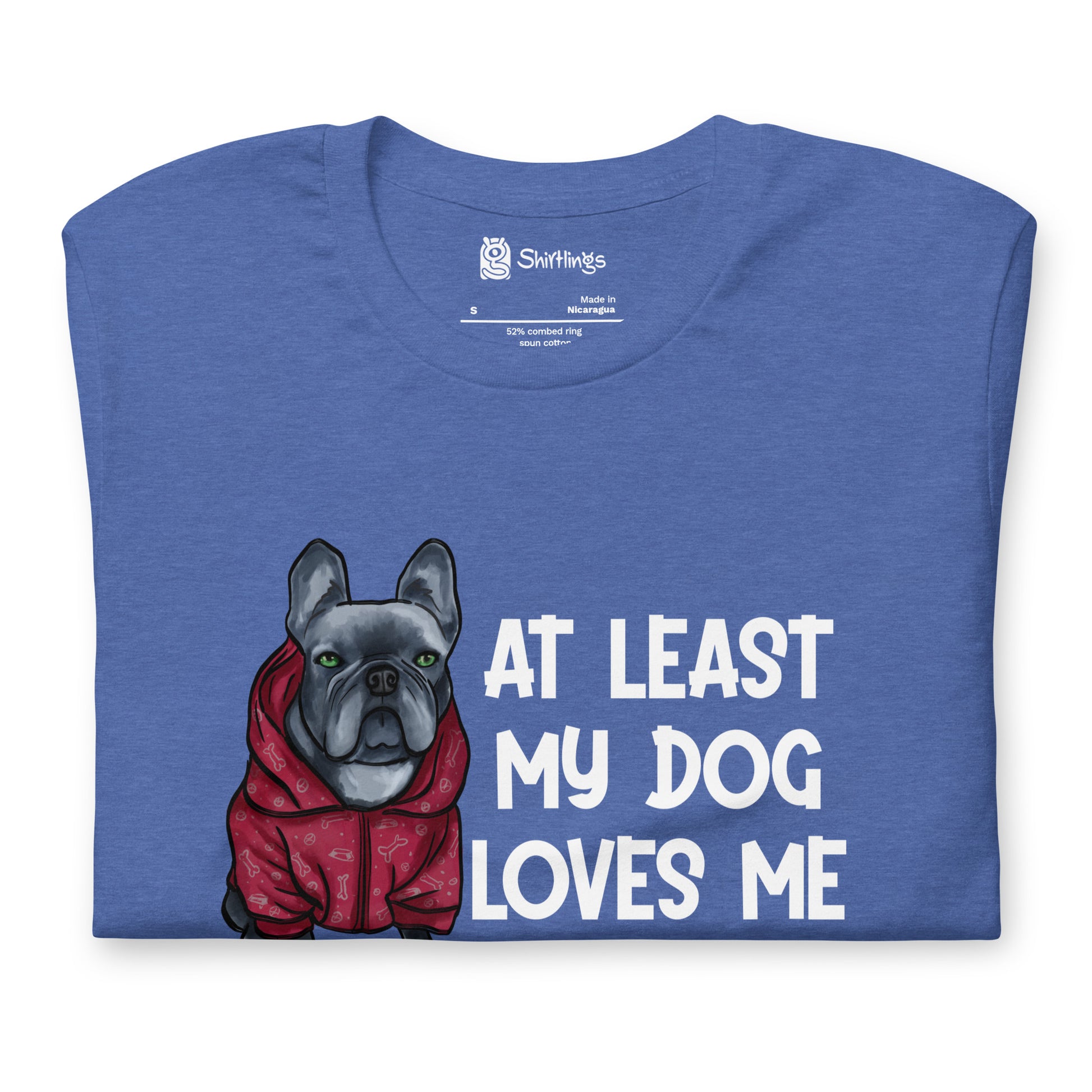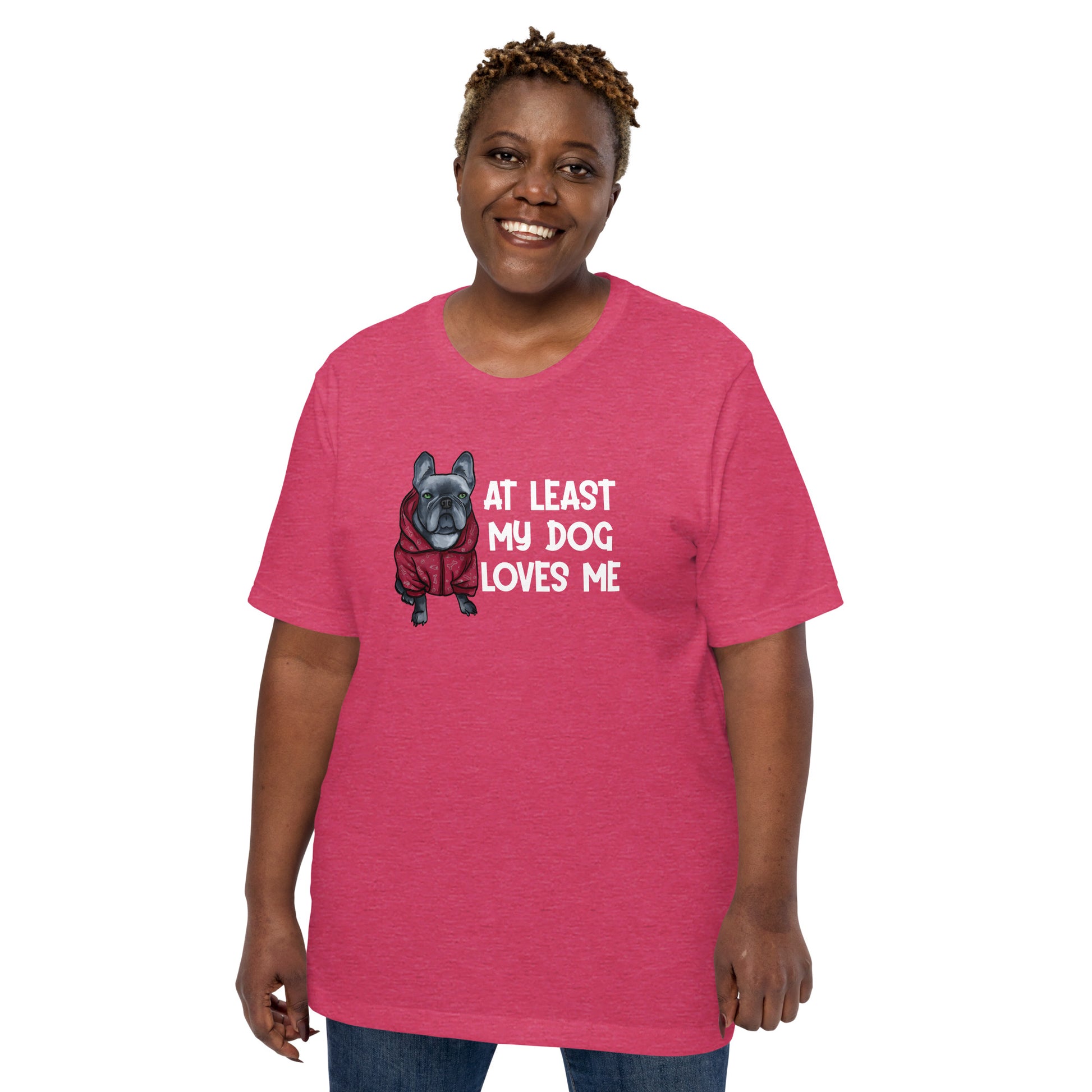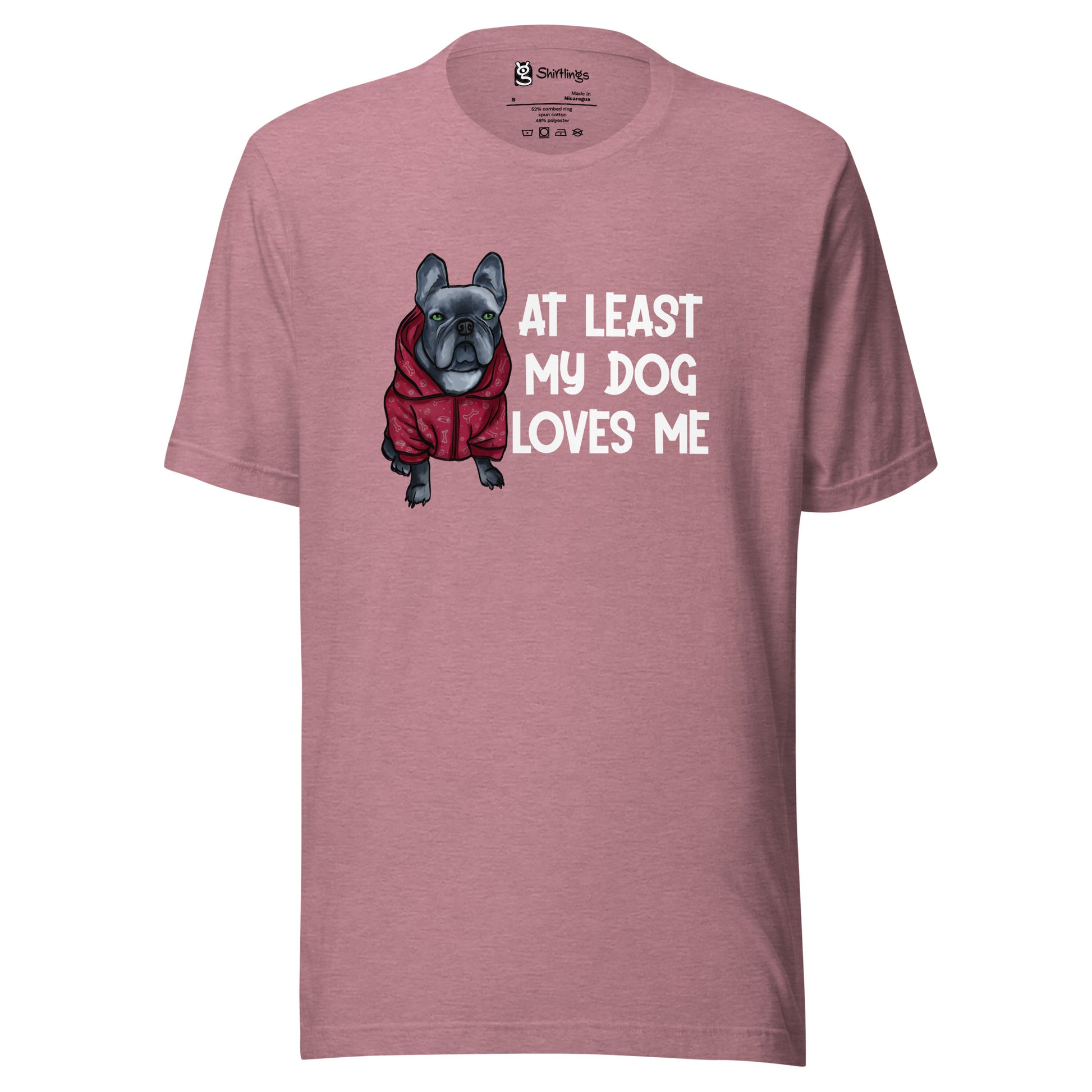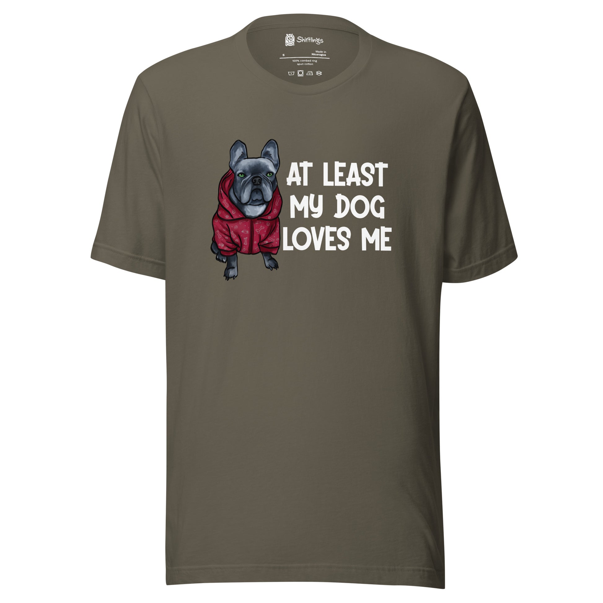 Embrace the unconditional love of your furry friend with our 'At Least My Dog Loves Me' tee, starring an irresistibly cute French Bulldog in a hoodie.